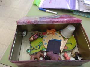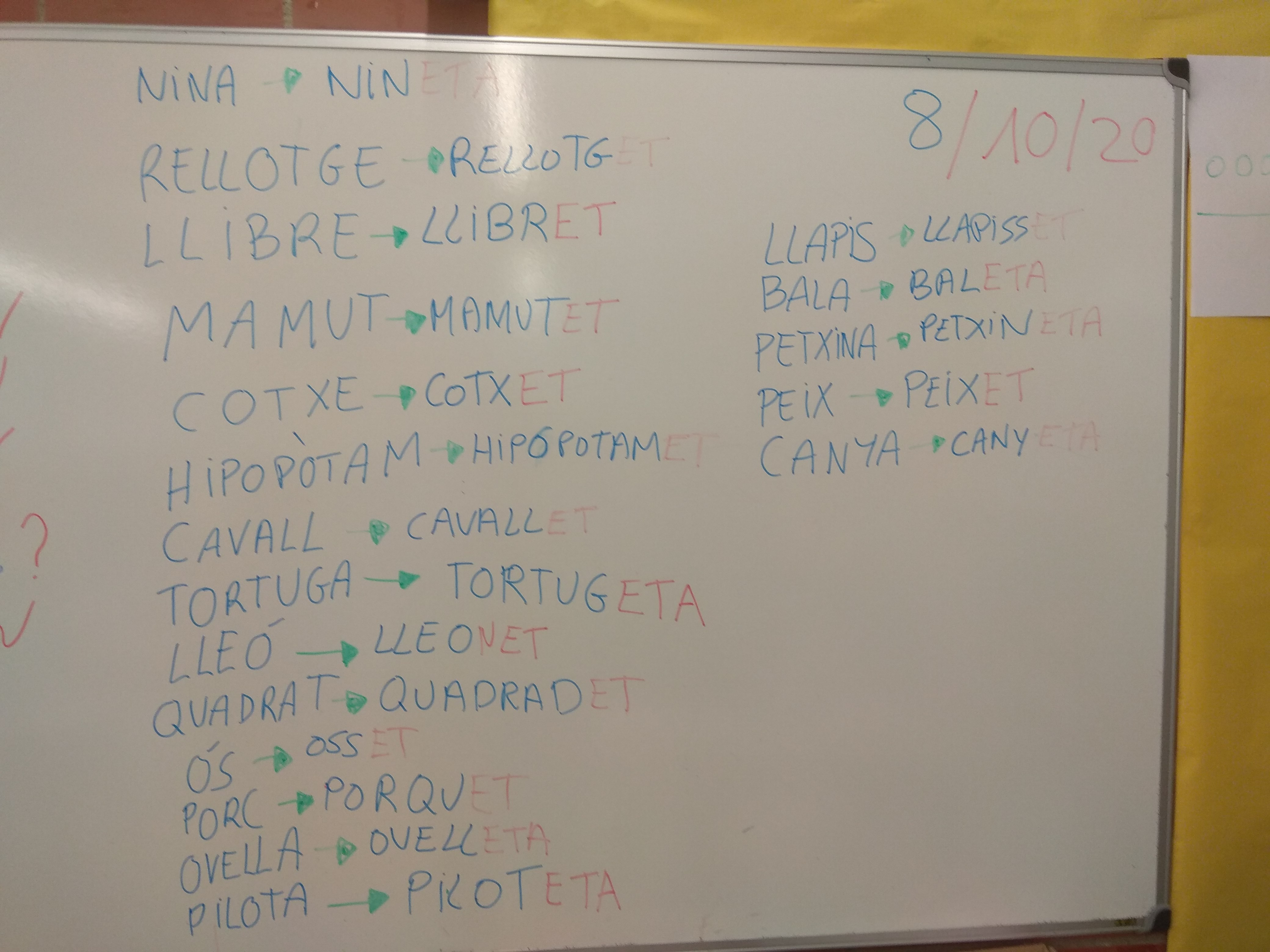 Aquesta setmana ens hem trobat una capsa plena d’objectes. Els hem anat traient i no enteníem què feien junts. No tenien res en comú (un cavall, un llapis, un cotxe, una pinça…). Hem anat escrivint els noms a la pissarra, per veure si descobríem alguna cosa…però res de res. Al final de tot hem trobat una altra capsa…en obrir-la i veure què hi havia dins hem començat a veure què passava… Dins la segona capsa hi havent els mateixos objectes, però molt petits. Hem escrit el nom al costat del d’abans i hem vist com es formen els diminutius, que són el nom de les coses petites. Ens ha agradat molt.