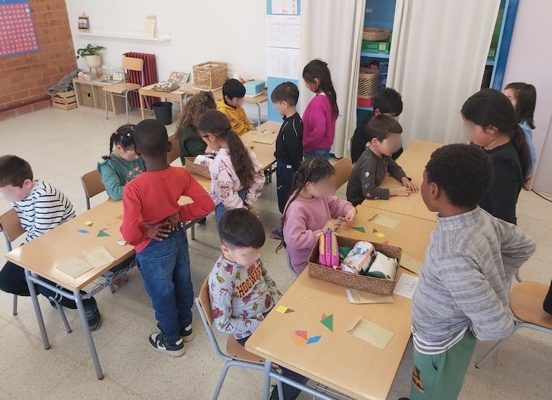 En aquesta ocasió els nens i nenes, per parelles, havien de construir una figura molt concreta i, sempre seguint la proposta plantejada, mitjançant un dictat i utilitzant les figures del Tangram.