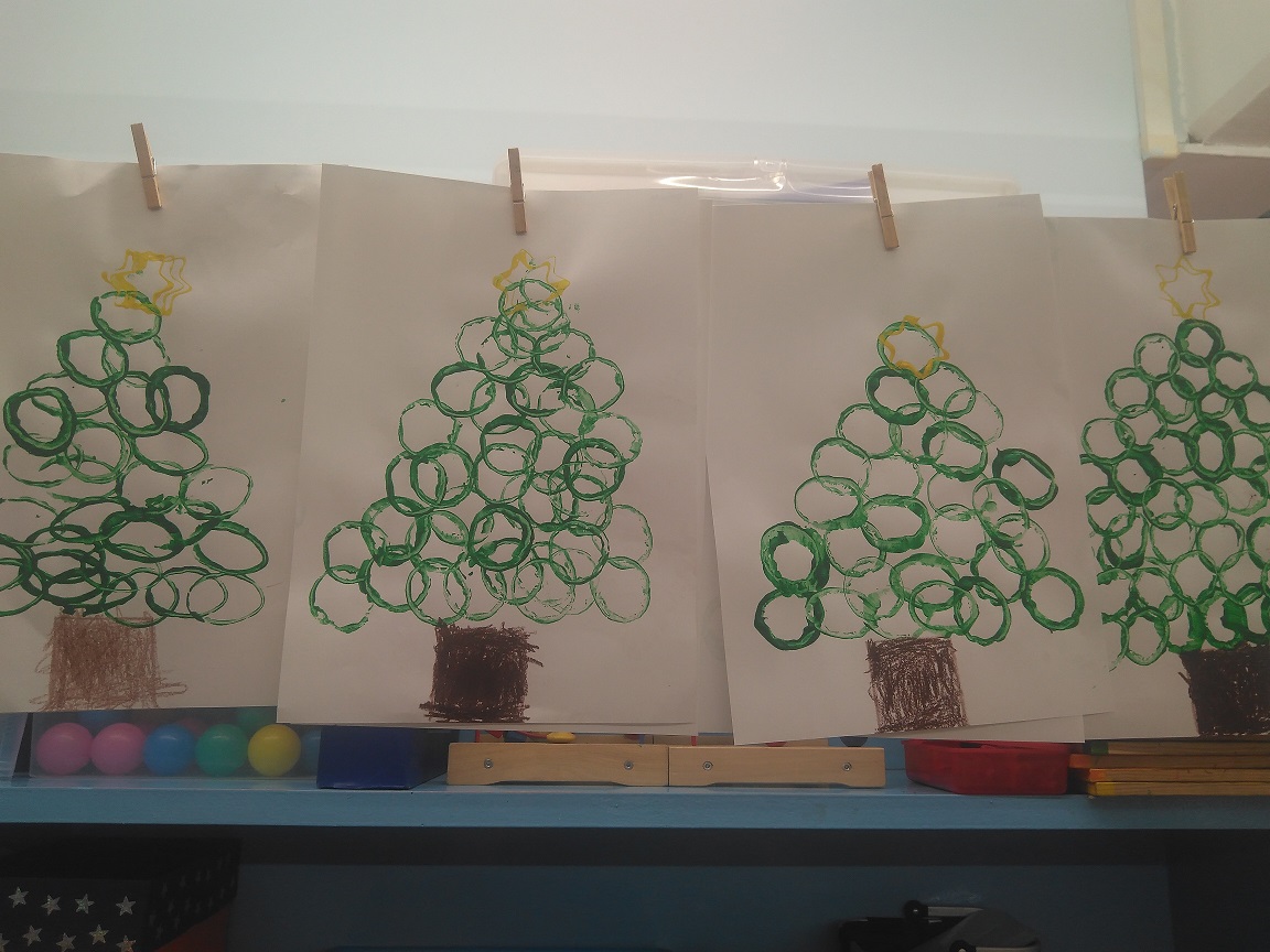 Apropant-nos al Nadal hem fet un arbre estampant rotllos de paper de wc i hem pintat boles nadalenques i les hem decorat amb purpurina.