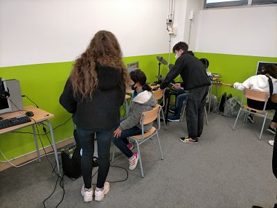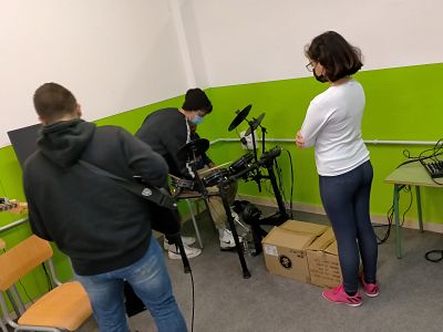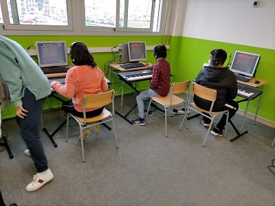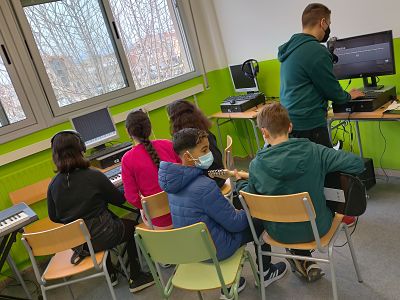 Vam poder gaudir de diferents instruments de música Rock, on els nostres alumnes van provar tant guitarres, baixos, bateries, pianos… amb diferents programes d’ordinador, amb l’ajuda dels alumnes d’aquest institut.