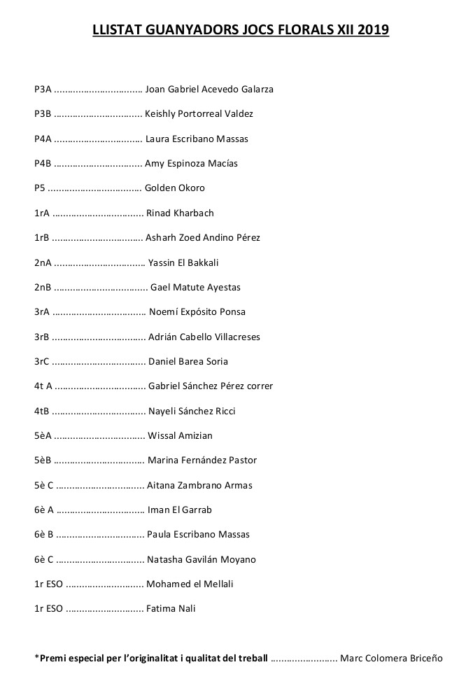 Els Jocs Florals 2019 admin23/04/19 Aquí us presentem els guanyadors dels Jocs Florals de la Diada de Sant Jordi. Gràcies a tots per la vostra participació!
