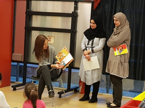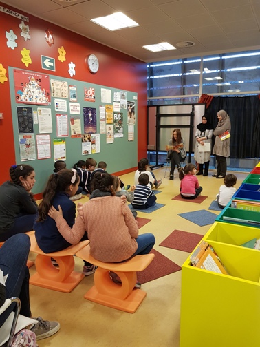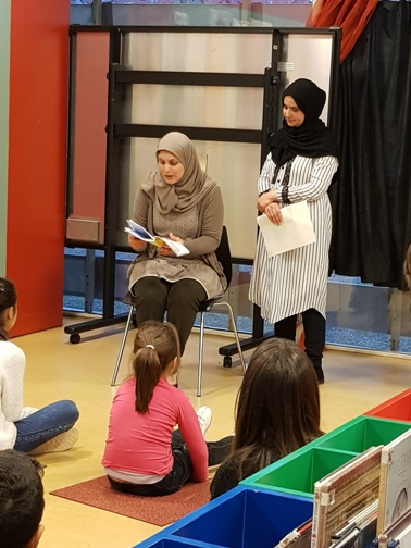 Des de fa alguns anys, l’escola intenta realitzar algunes activitats conjuntament amb la biblioteca pública del nostre districte. Ja sabeu que cada mes a la biblioteca es fa “l’Hora del conte”, on podeu gaudir de la tradició d’explicar contes i històries per als més petits i per als que ja no ho són tant. Cada any, la biblioteca ens demana que una d’aquestes hores del conte sigui realitzada per algunes mares o pares de la nostra escola i expliquin contes típics del seu país.