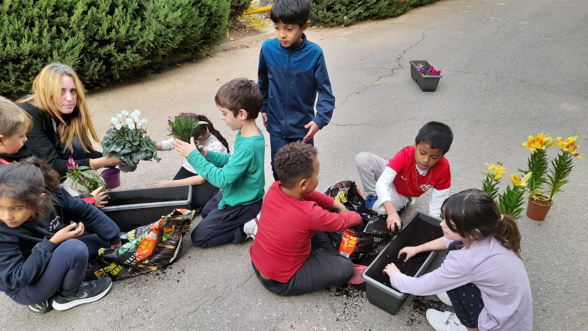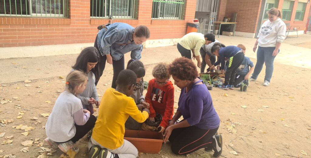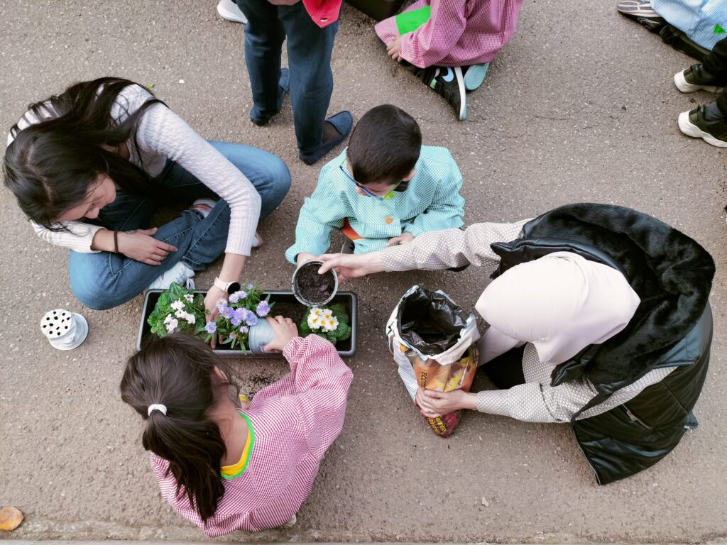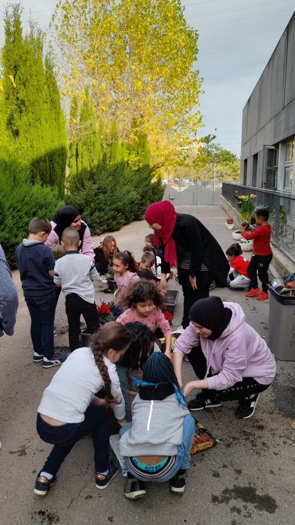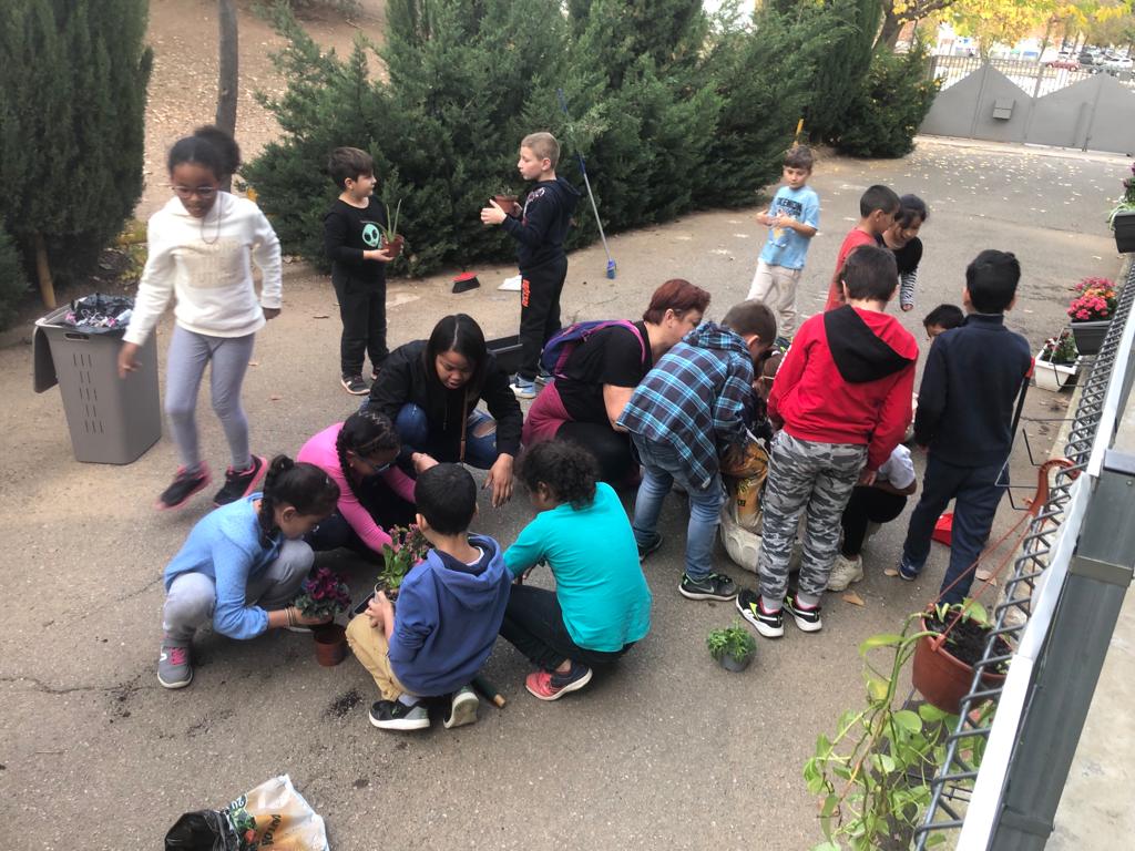 Fa uns dies les mestres de la Comunitat de Mitjans vam demanar a les famílies la seva participació portant una planta a l’escola. Aquesta tarda les nenes i els nens de 1r, 2n i 3r han sortit al pati a trasplantar aquestes plantes en jardineres. Per això, han vingut unes quantes mares i pares a ajudar-nos. També han entrat les famílies a les classes per ajudar en alguns treballs manuals.