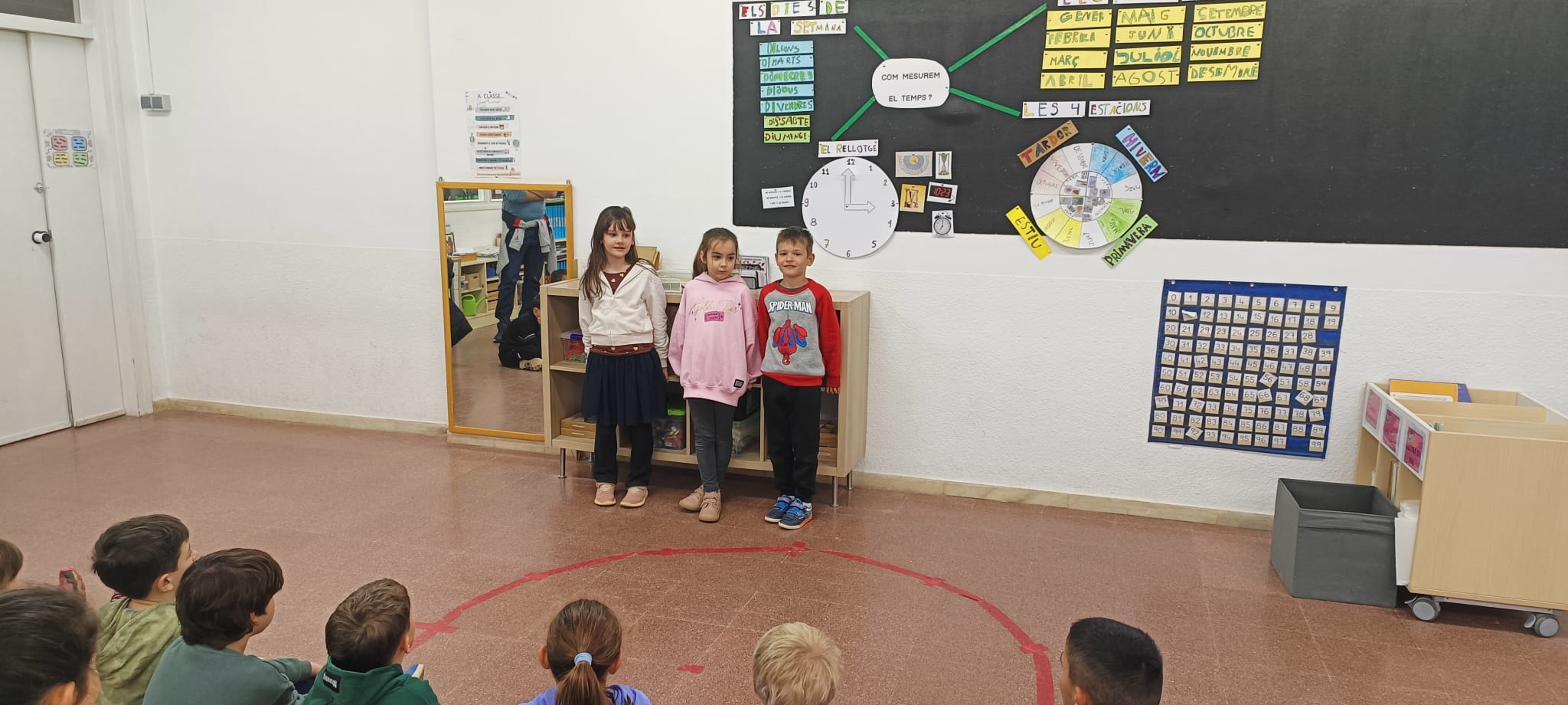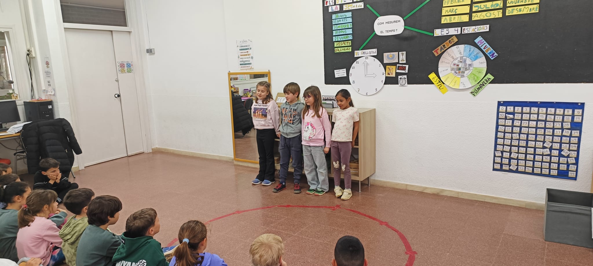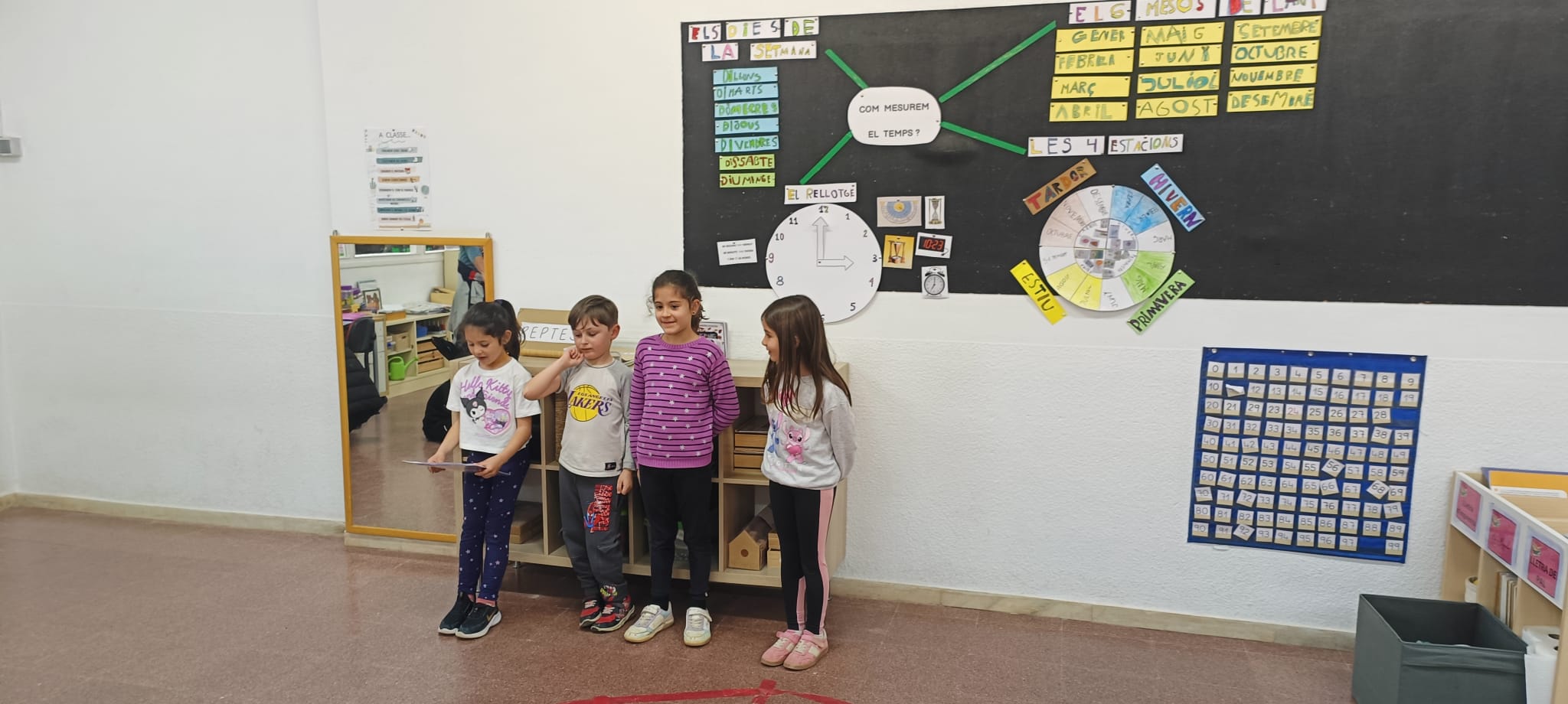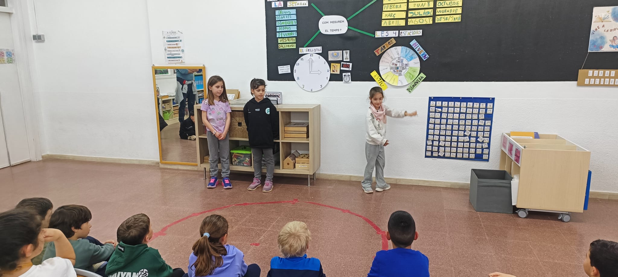 Hem aprés que el temps el podem mesurar amb setmanes i que una setmana té 7 dies, que un any té 12 mesos, que tenim 4 estacions: primavera, estiu, tardor i hivern, i ens hem endinsat en el món del rellotge. Hem vist que amb el rellotge podem comptar els segons, els minuts i les hores. I, per tant, ens hem adonat que un dia té 24 hores.