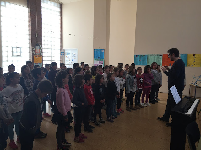 Avui a l’escola ha vingut en Dani Pérez, el director de la Cantata municipal. Hem fet un assaig tots junts i ens ha donat indicacions importants sobre els gestos, els ritmes, la veu… Hem estat molt contents de poder assajar amb ell i ens ho hem passat molt bé!