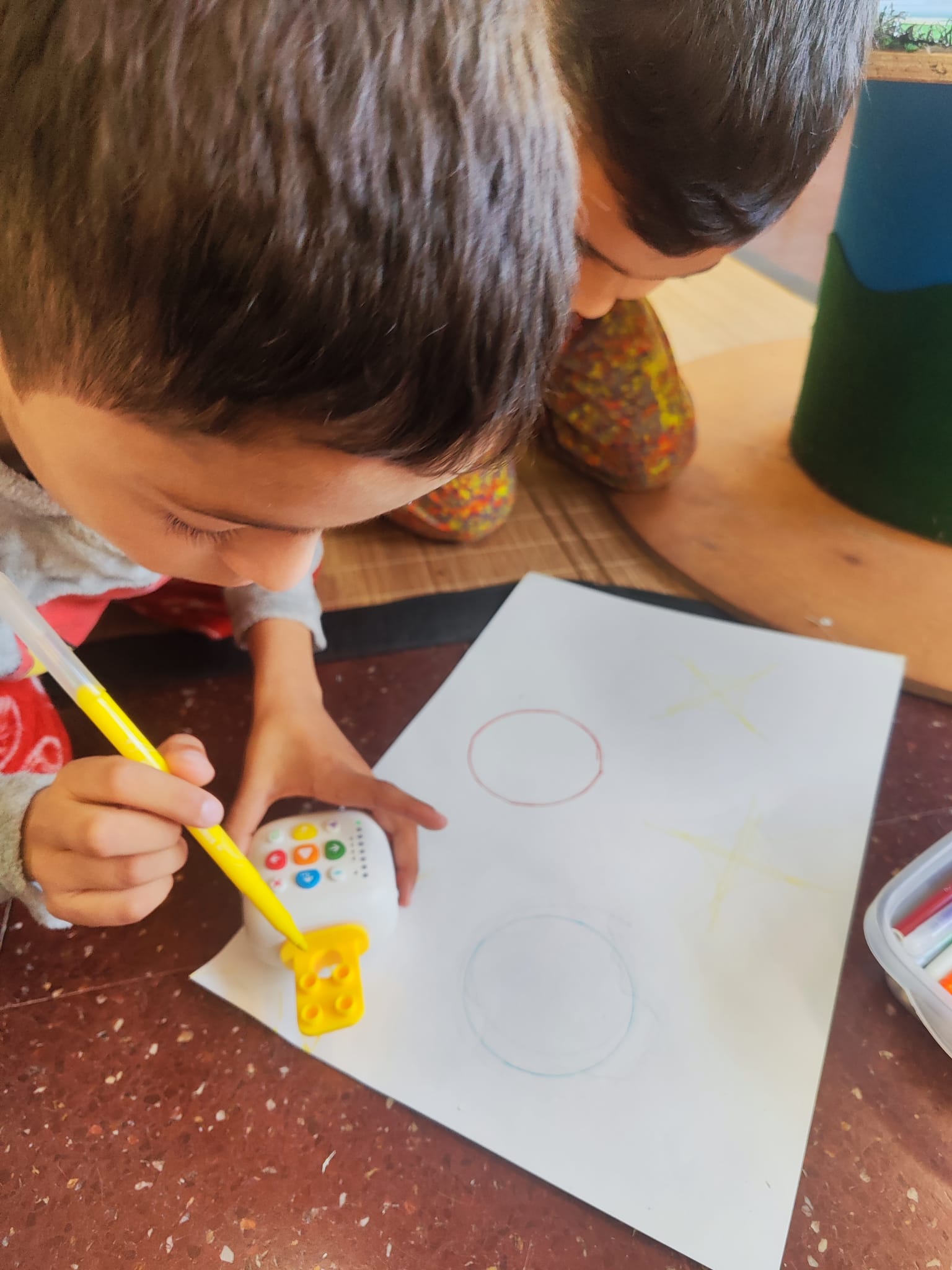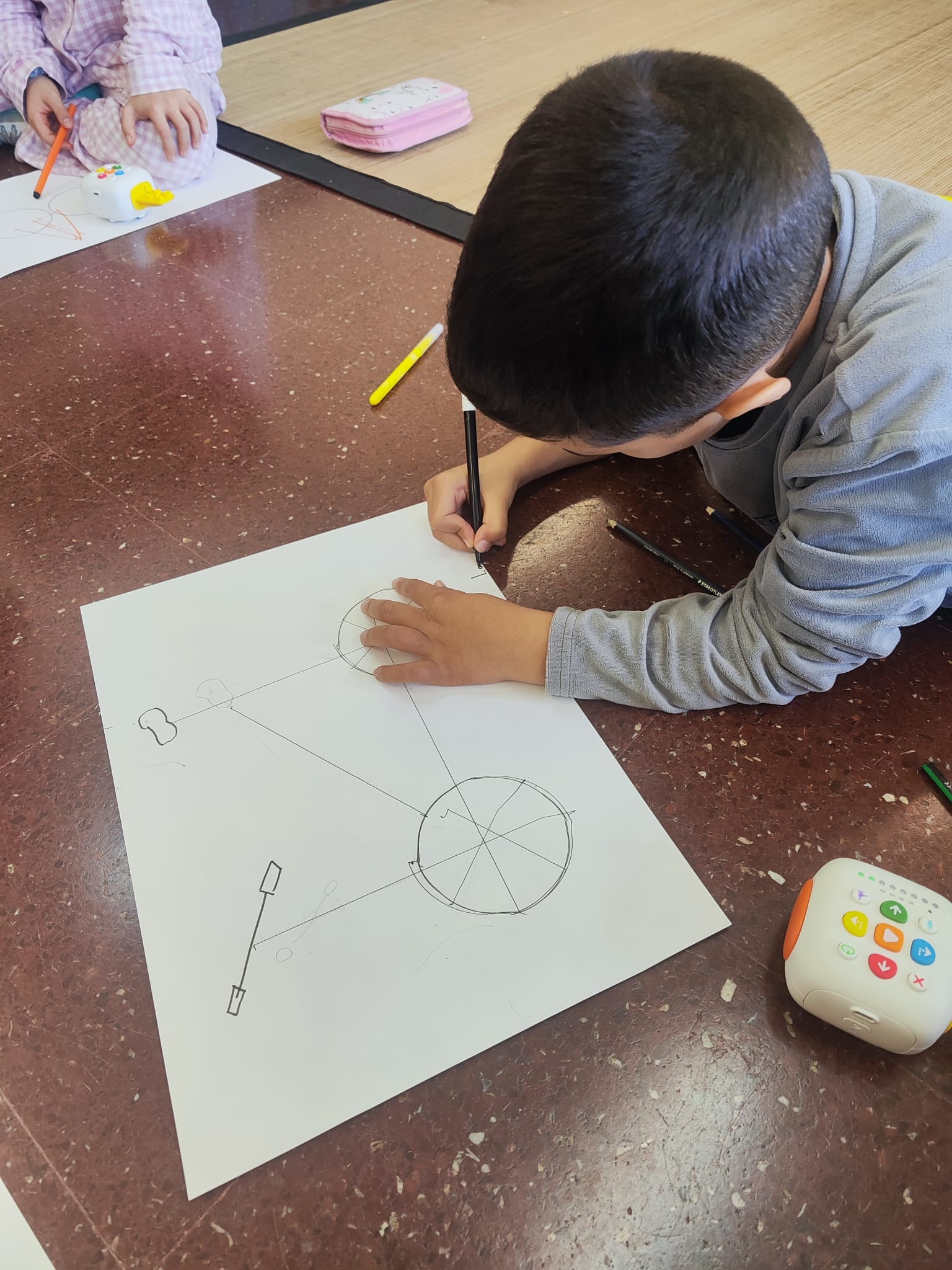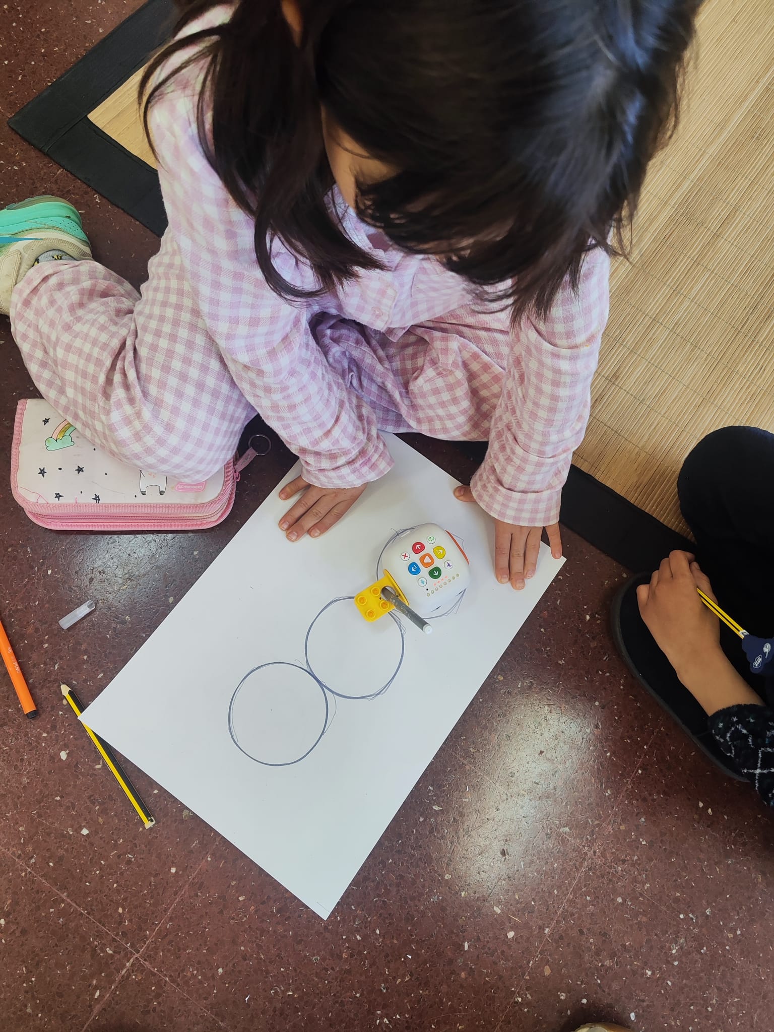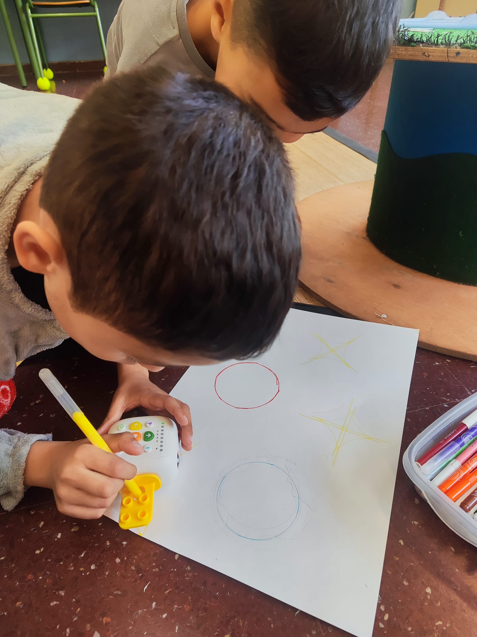 Els alumnes de tercer de primària han experimentat amb el robot Tale-Bot i el seu accessori per dibuixar formes geomètriques. Han programat el robot per crear quadrats, triangles i cercles, combinant per fer dibuixos sobre el que veuen cada dia als carrers. Aquesta activitat ha sigut molt bona per millorar el treball en equip i ajudar a comprendre la programació d’una forma divertida.