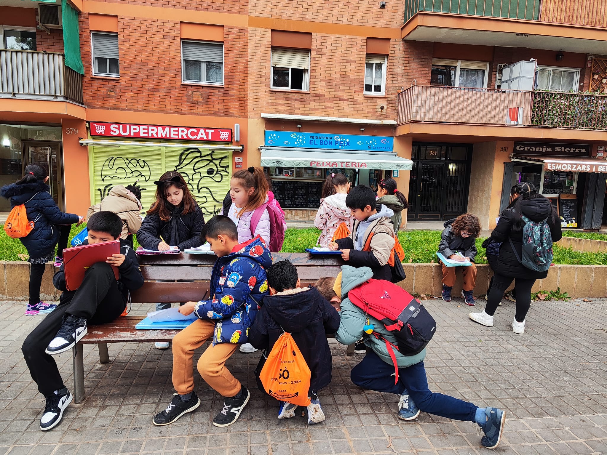Avui hem sortit a passejar pel barri amb una mirada diferent, fixant-nos en les figures geomètriques que formen part del nostre entorn. Hem descobert que estan presents en edificis, senyals de trànsit, bancs i fins i tot en els aparadors dels comerços locals. A més, hem aprofitat per conèixer millor les botigues i establiments que tenim a prop de l’escola, identificant quins serveis ofereixen i com contribueixen a la vida del barri.