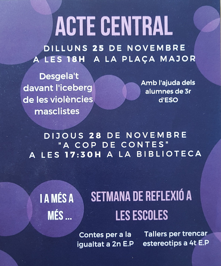 El 25 de novembre va ser declarat Dia Internacional per l’Eliminació de la Violència envers les dones. Aquest dia, ajuntaments i associacions, organitzen activitats dirigides a sensibilitzar la ciutadania per tal que homes i dones tinguem els mateixos drets, i per aprendre que els problemes no s’arreglen amb violència.