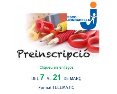El Departament d’Educació ha posat en marxa el web preinscripcio.gencat.cat, amb la finalitat d’acompanyar millor les famílies durant el procés de preinscripció 2021-2022 als ensenyaments obligatoris. Codi de l’escola Joncadella: 08026725 Informació pas a pas de la preinscripció de 3 a 6 anys Informació pas a pas de la preinscripció de 6 a 12 anys