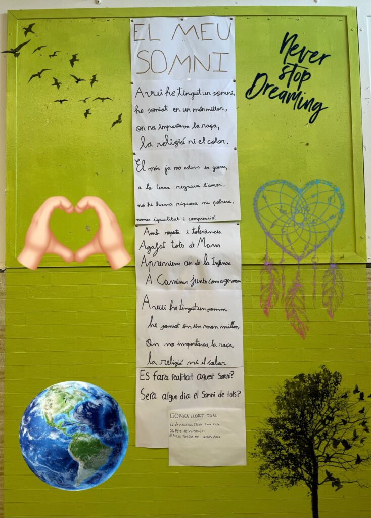 L’alumnat de cinquè s’ha encarregat de decorar el vestíbul aquest mes, i quin millor dia que el 30 de gener per recordar la importància de cuidar la pau amb el poema “Si el món fos…” de la Joana Raspall.