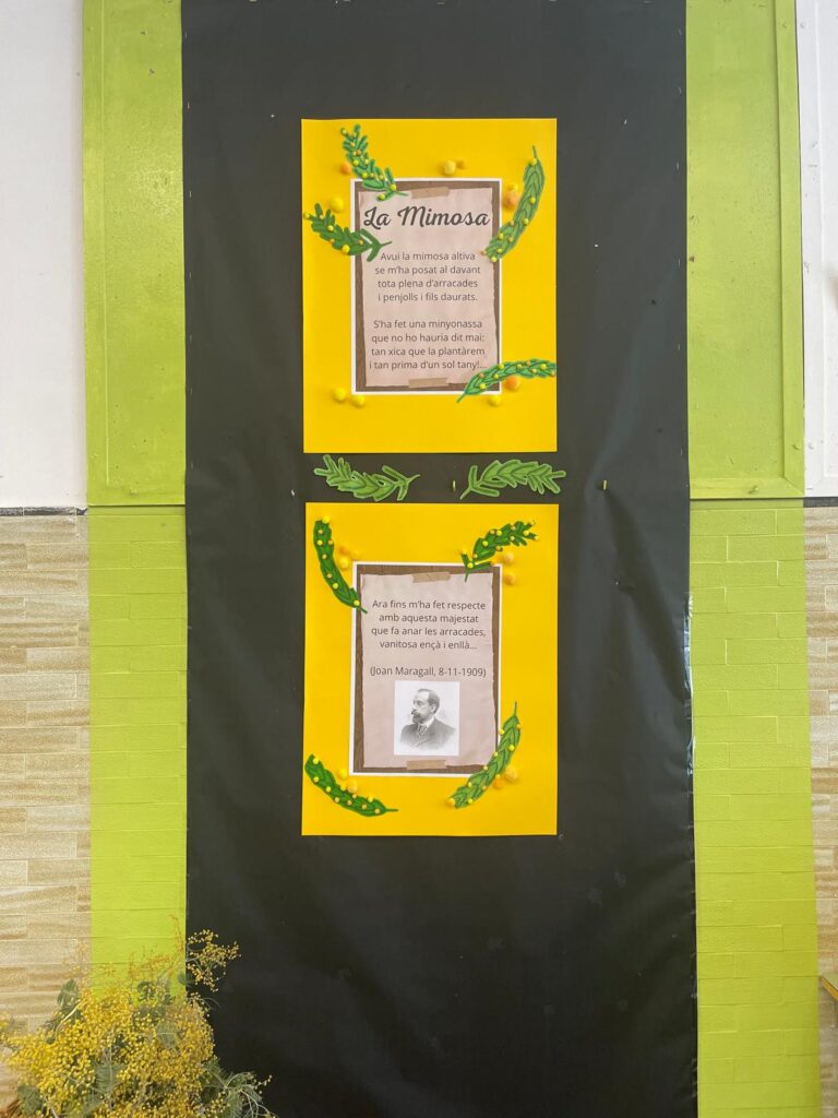 El vestíbul s’ha tenyit de groc amb el poema “La Mimosa” de Joan Maragall que l’alumnat de 3r ha treballat i que aquests dies floreix amb força.