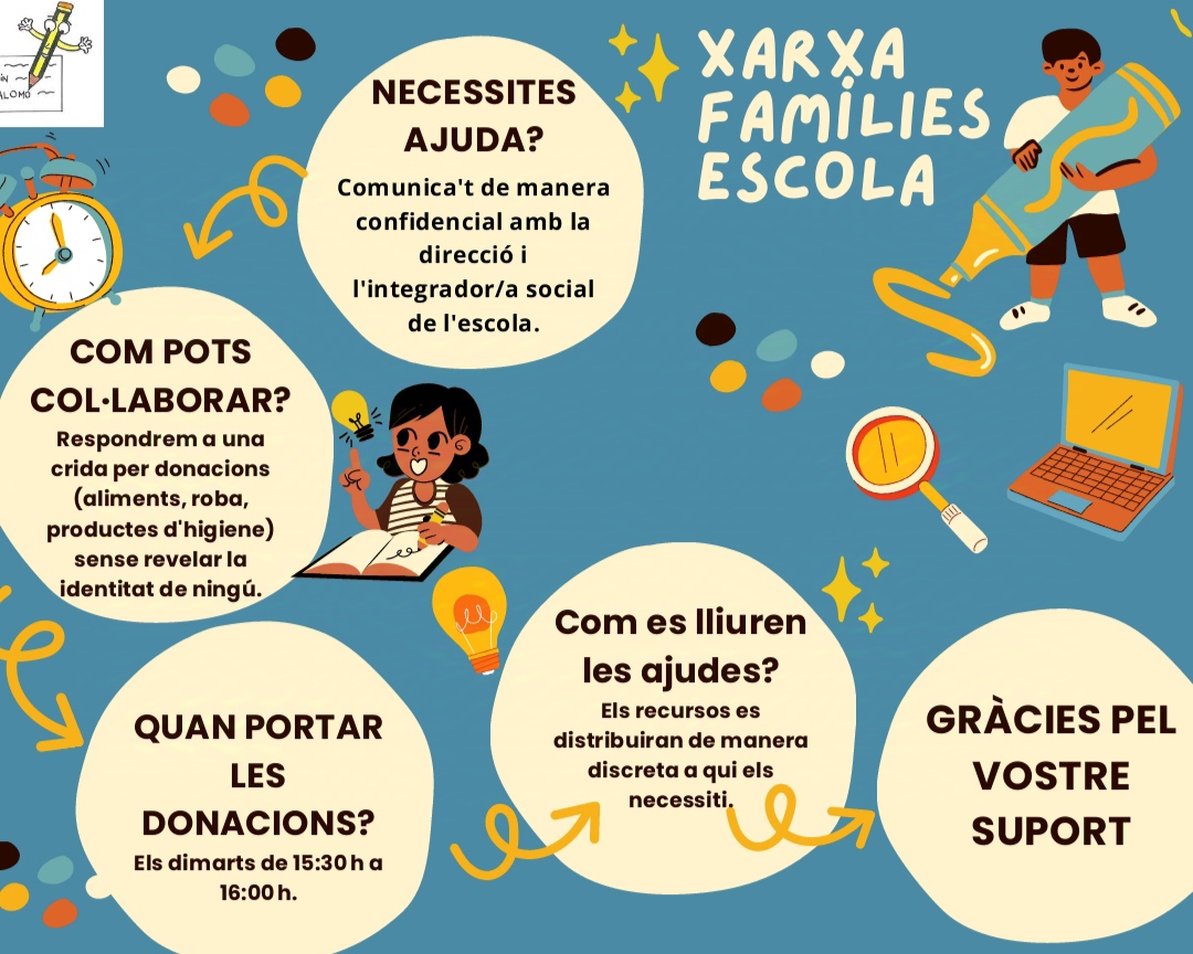 Aquest any, des de l’escola, iniciem un projecte solidari per combatre les dificultats econòmiques i socioculturals d’algunes famílies de la nostra comunitat. És per aquest motiu que, si vols i pots col·laborar, podràs participar aportant voluntàriament donacions (aliments, roba i productes d’higiene) que, de manera confidencial l’escola lliurarà a les famílies pactades. Cada granet d’arena compta. Per un millor futur i una educació solidaria i de qualitat!