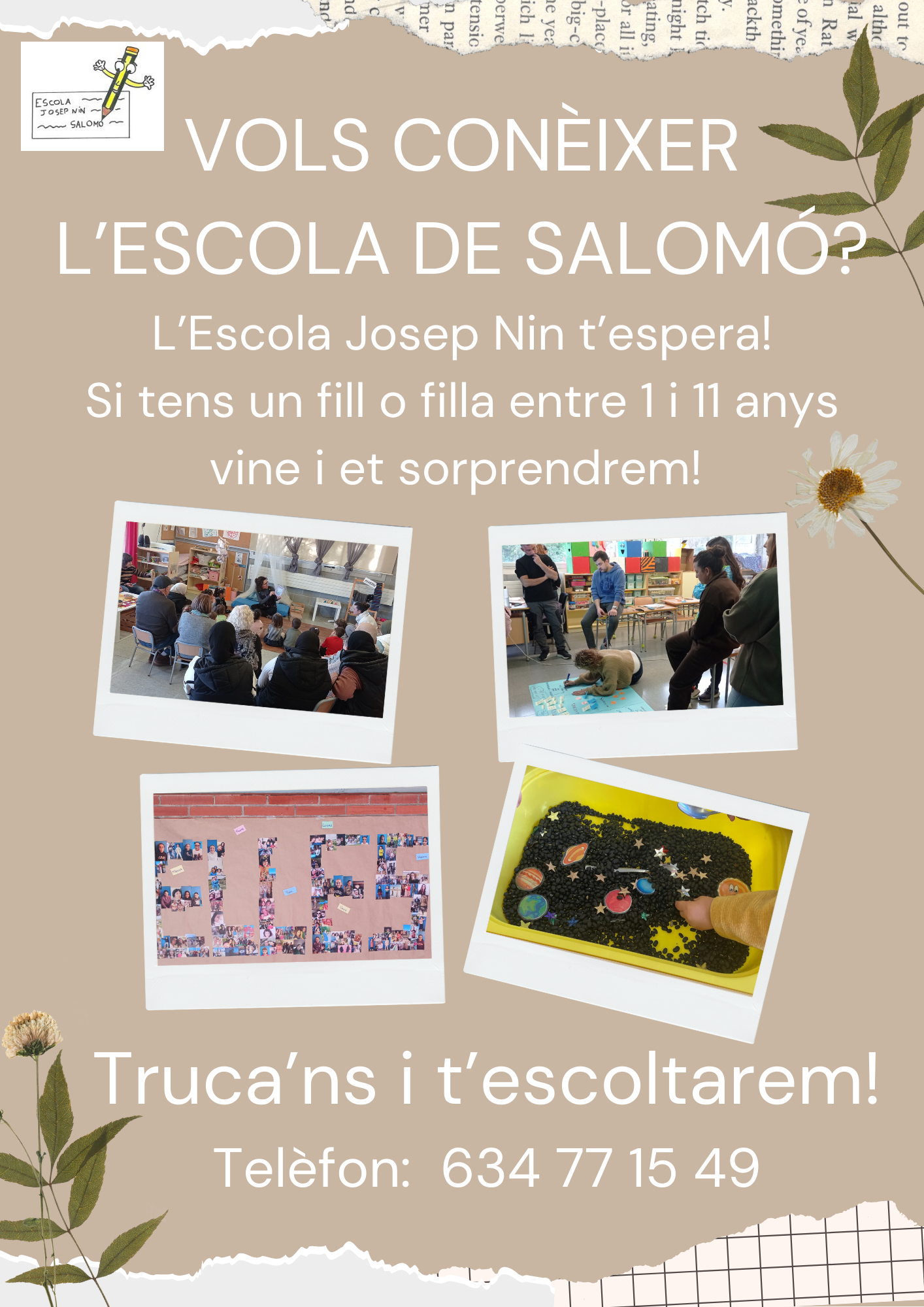 L’equip educatiu us espera a l’escola perquè podeu conèixer el nostre funcionament, els nostres espais, la nostra metodologia, el nostre Projecte Educatiu i, en definitiva, els nostres valors com a professionals apassionats i dedicats a l’educació de cada un dels infants que venen a la nostra escola. Si ets una  família que busca una educació de qualitat del seu fill/a, en un entorn rural i familiar, truca’ns en el telèfon 634 77 15 49 i concerta un dia per venir-nos a veure! Us hi esperem!!!