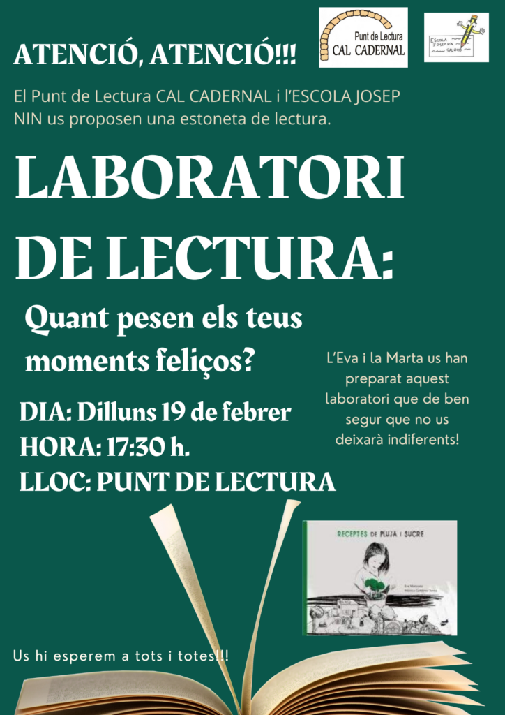 El proper dilluns dia 19 de febrer les responsables de la comissió de biblioteca de l’escola realitzaran un laboratori de lectura al punt de lectura de Cal Cadernal del nostre poble, Salomó!