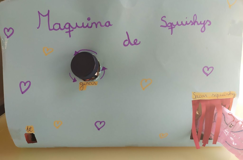 Hem de col·locar la figura anti estrés a la plataforma enganxada al tub i tancar la tapa. A continuació girem el tub i ja estaria acabat. Només hem de ficar la mà pel forat que hem fet al principi, agafar la nostra figura anti estrés i fer el que vulguem amb ella.