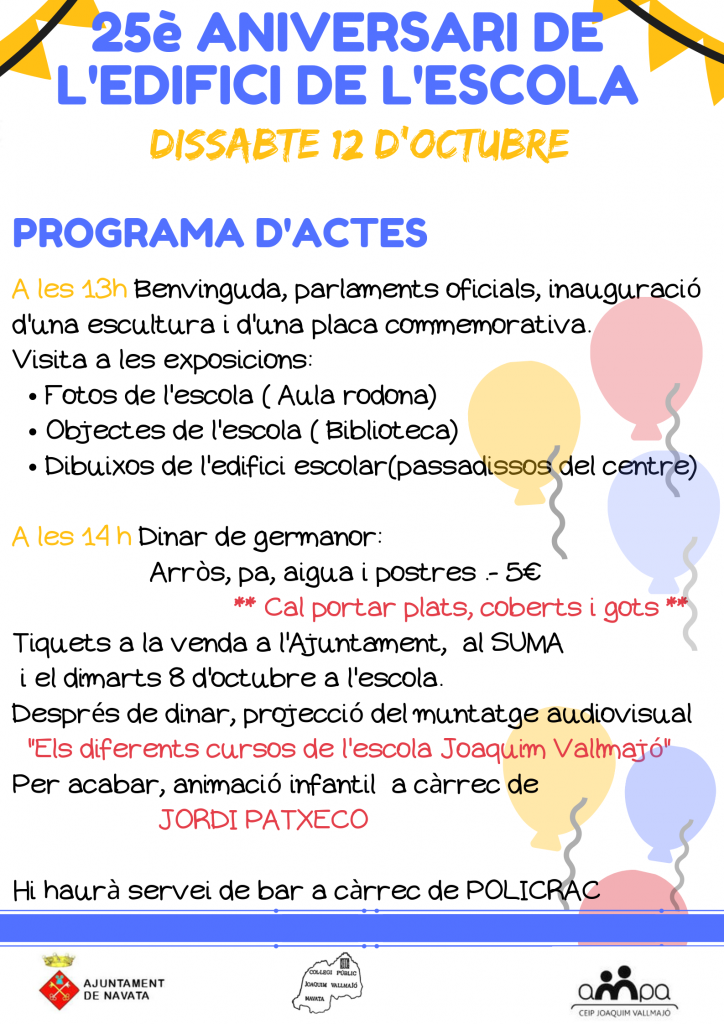 El proper dissabte 12 d’octubre, celebrarem el 25è aniversari de l’edifici actual. 25 anys d’escola nova! Els actes començaran a la una del migdia. Us hi esperem a tots!