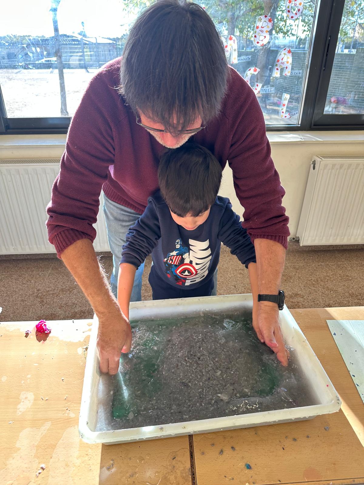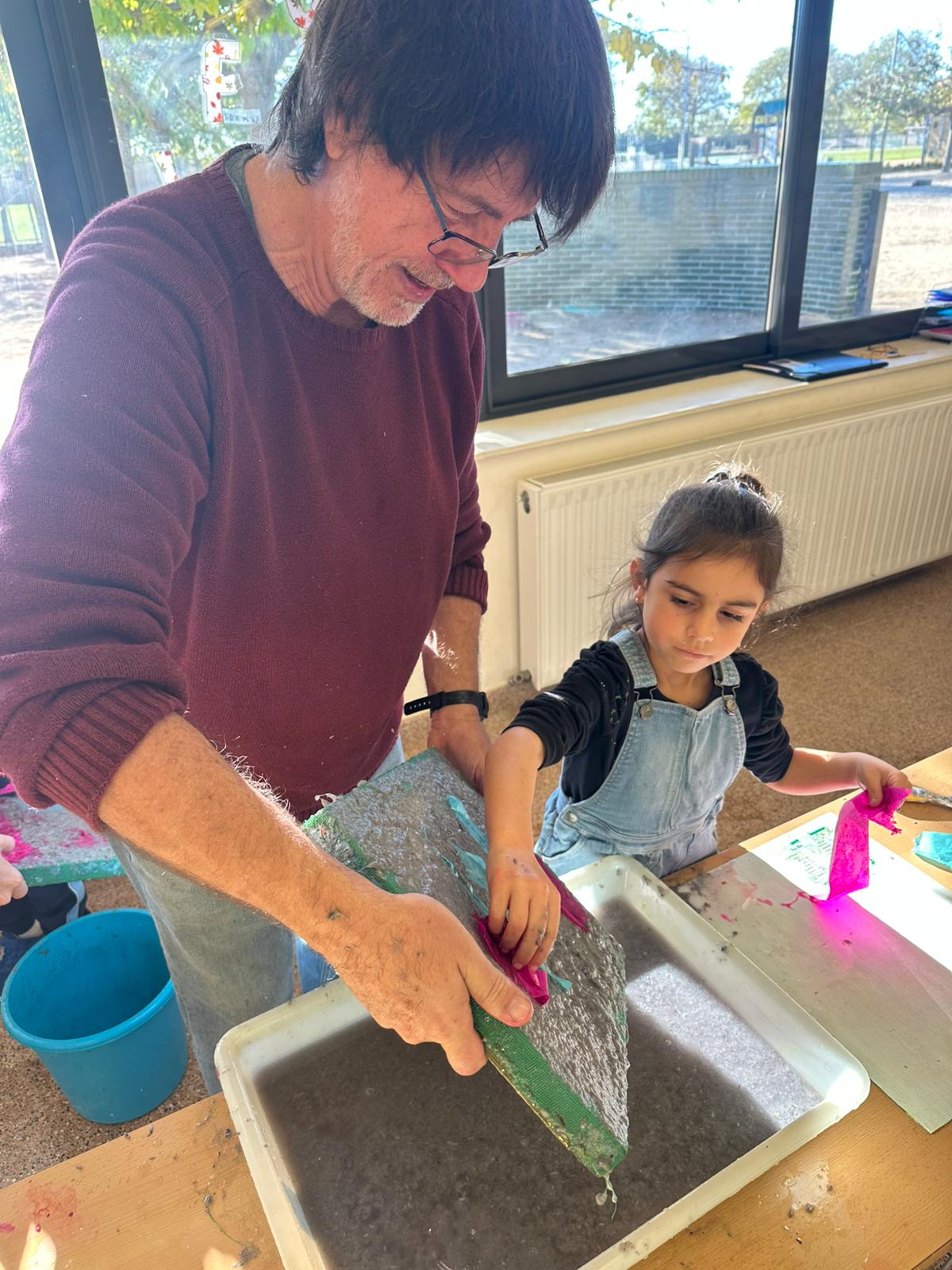 Fa uns dies en Xavier Vizcaíno va venir a l’escola a fer un taller de paper reciclat amb els nens i nenes de Cicle Inicial.
