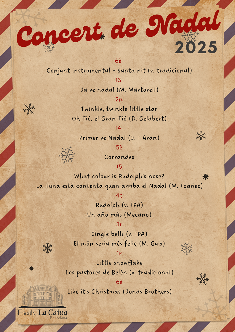 Bones festes a tothom Amb les melodies d’ahir encara ressonant, donem per inaugurat el període nadalenc a l’escola. Des de la direcció i tot l’equip de mestres, us desitgem unes molt Bones Festes i un Feliç Any Nou.