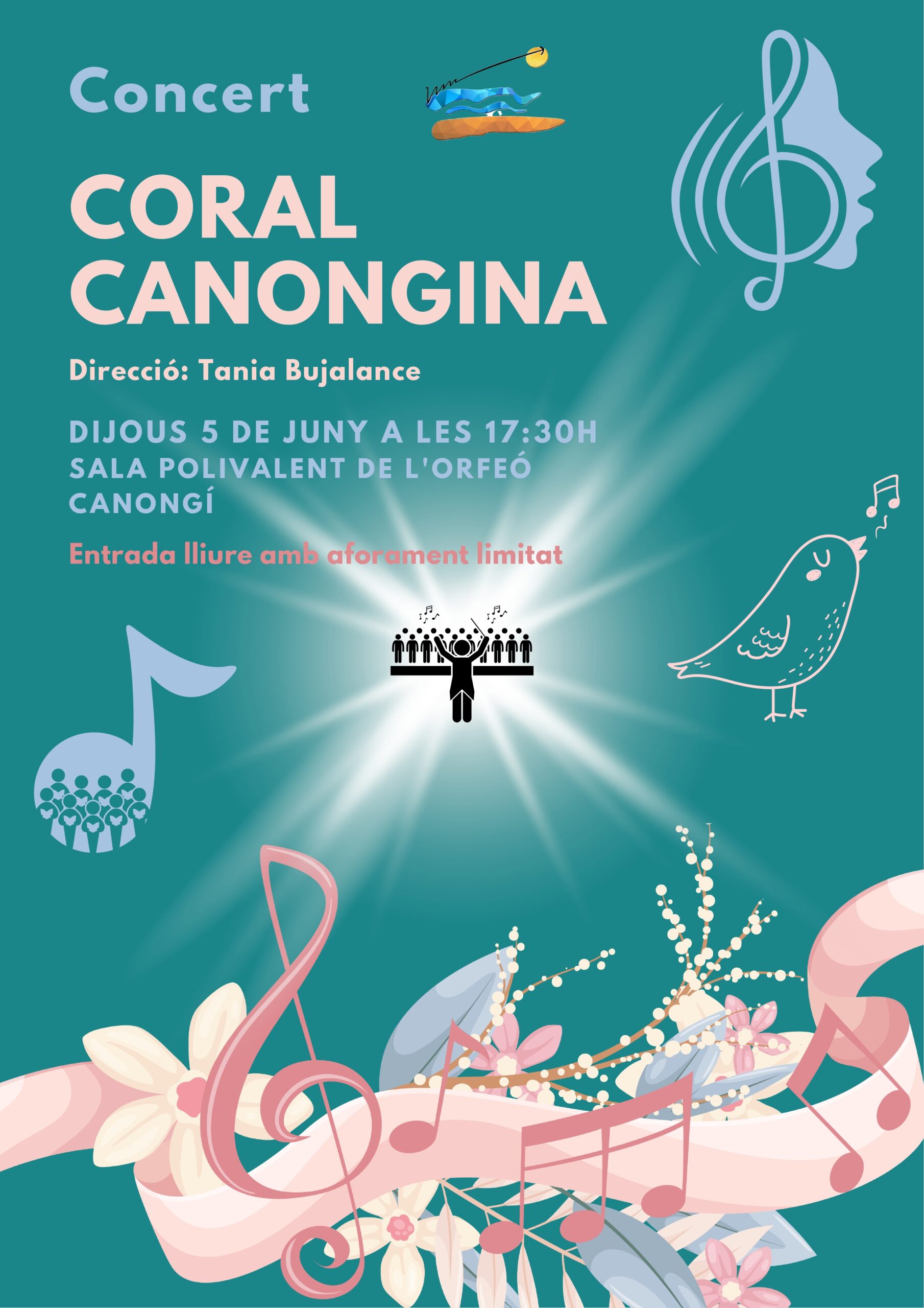 Us comuniquem que el dijous de la setmana vinent, el dia 05 de juny de 2025, a les 17:30h, a la SALA POLIVALENT DE L’ORFEÓ CANONGÍ, la nostra estimada CORAL CANONGINA (activitat extraescolar) durà a terme un concert.