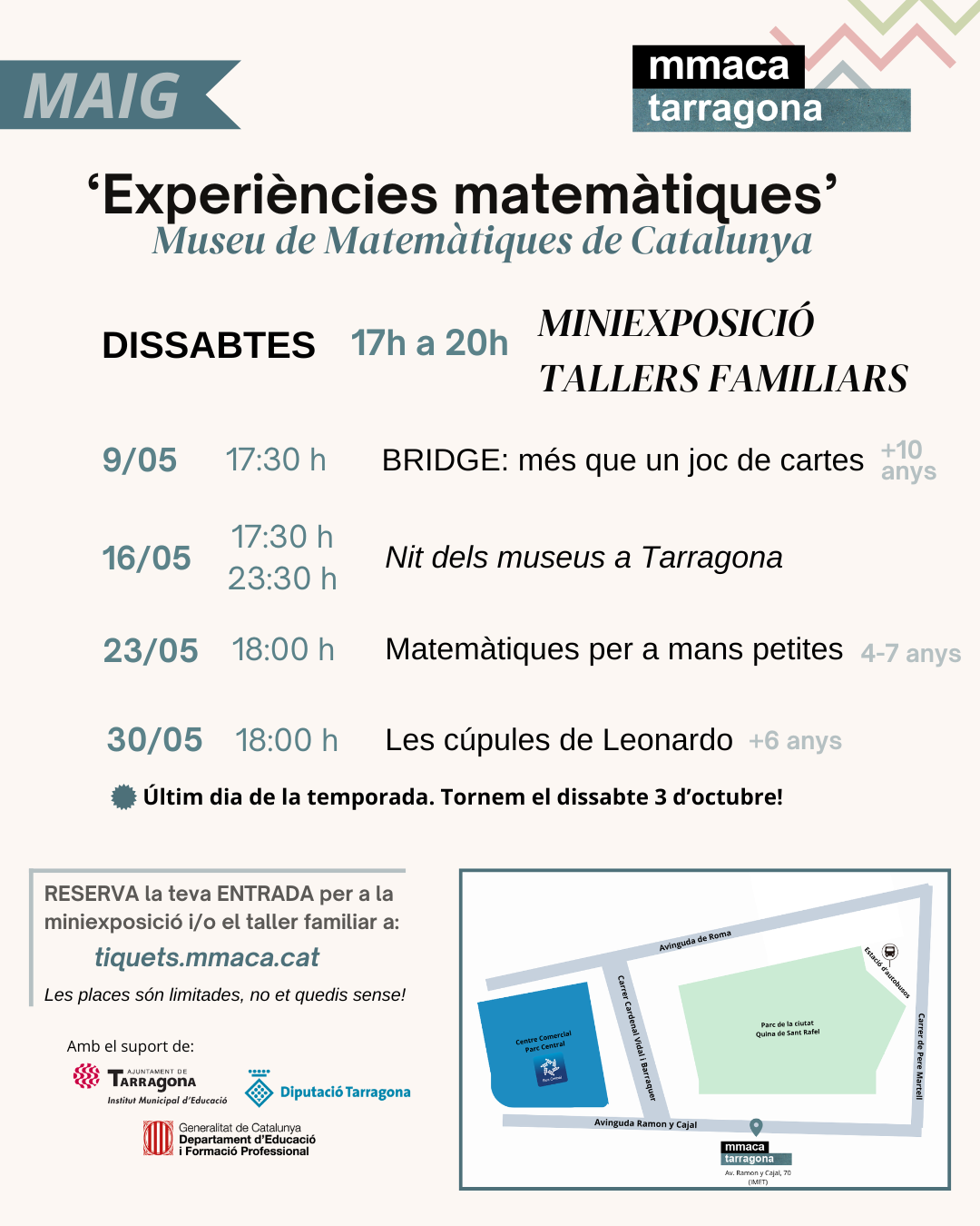 Des del MUSEU DE MATEMÀTIQUES DE CATALUNYA A TARRAGONA, ens demanen poder fer difusió entre les famílies del centre de la PROGRAMACIÓ DE TALLERS FAMILIARS DEL MES DE MAIG.