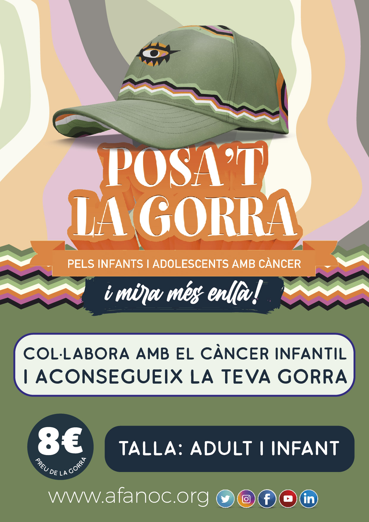 El disseny de la gorra d’aquest any és de l’artista de carrer, d’origen brasiler, Tarsila Schubert. La seva inspiració prové del seu bagatge multicultural i és l’essència de la seva producció. A la gorra, hi predomina el color verd incorporant sanefes en negres, taronges, roses, verds i blancs. Al frontal de la gorra, hi apareix un ull, que interpretem com a expressió de l’atenció, la cura i l’acompanyament que l’AFANOC ofereix a les famílies al llarg del procés del càncer infantil.