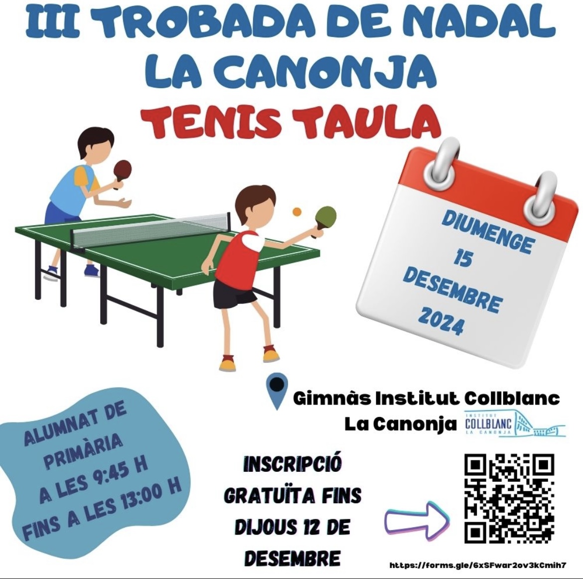 L’Institut Collblanc organitza el pròxim dia 15 de desembre a partir de les 9:45 la 3a Trobada de Nadal de Tennis Taula dirigida a l’alumnat de 4t a 6è de primària.