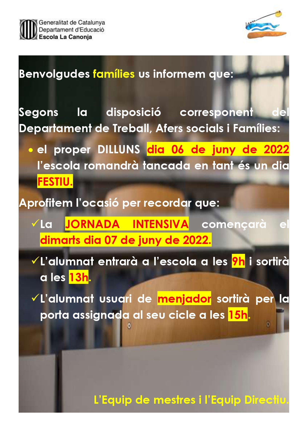 CIRCULAR INFORMATIVA DIA FESTIU + INICI JORNADA INTENSIVAPer Elisenda Virgili / 2 de juny de 2022 / Cicle Inicial Cicle Mitjà Cicle Superior General Infantil Portada