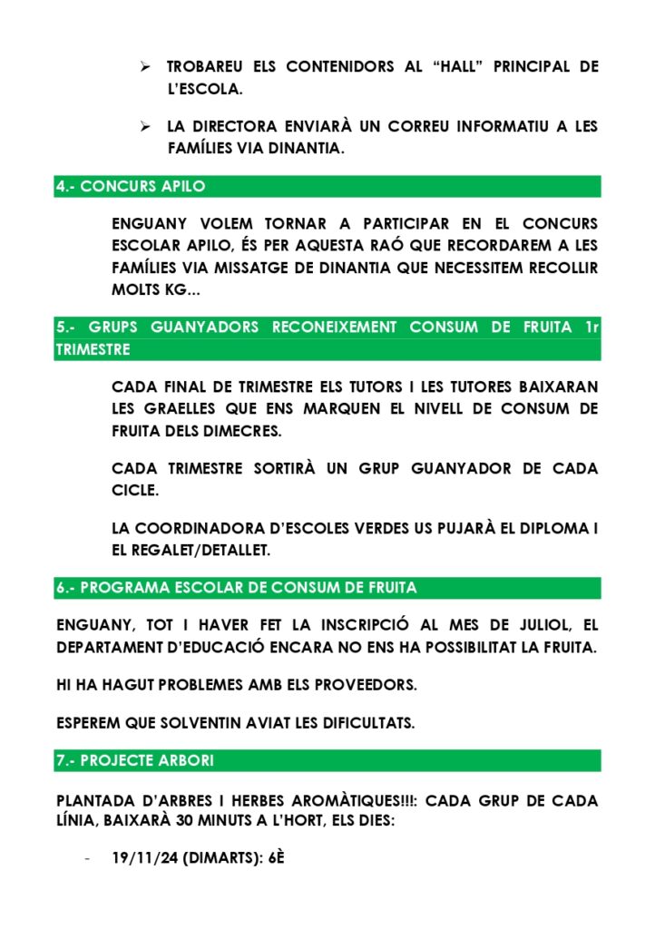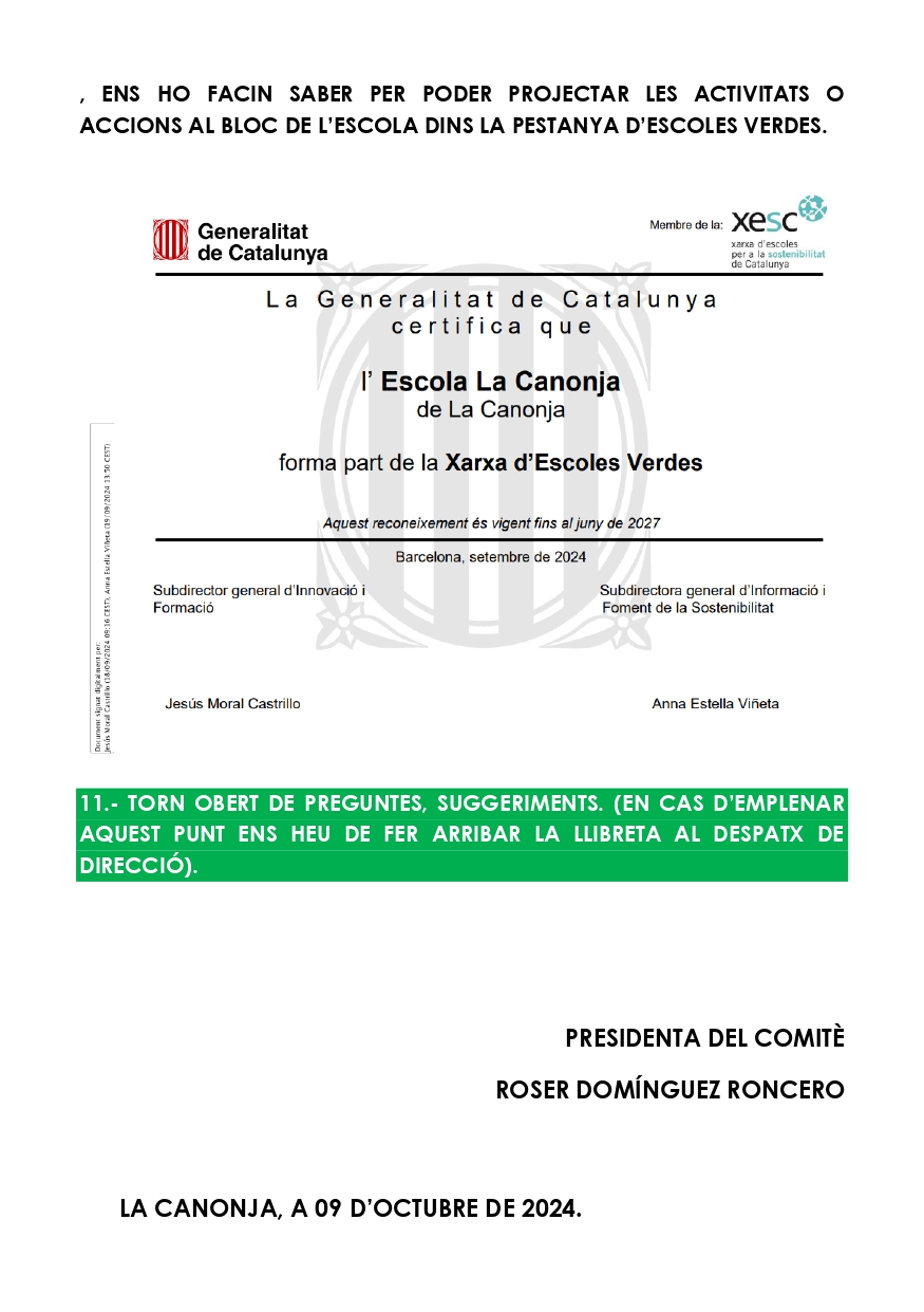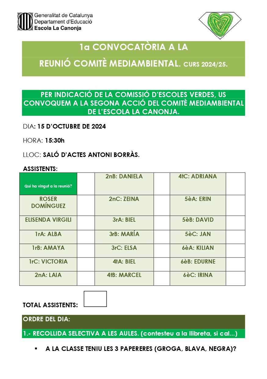 CONTINGUT DE LA 1a CONVOCATÒRIA DEL 1r COMITÈ MEDIAMBIENTAL DE L’ESCOLA LA CANONJAPer Elisenda Virgili / 22 d'octubre de 2024 / Cicle Inicial Cicle Mitjà Cicle Superior General Portada SOM Escola Verda