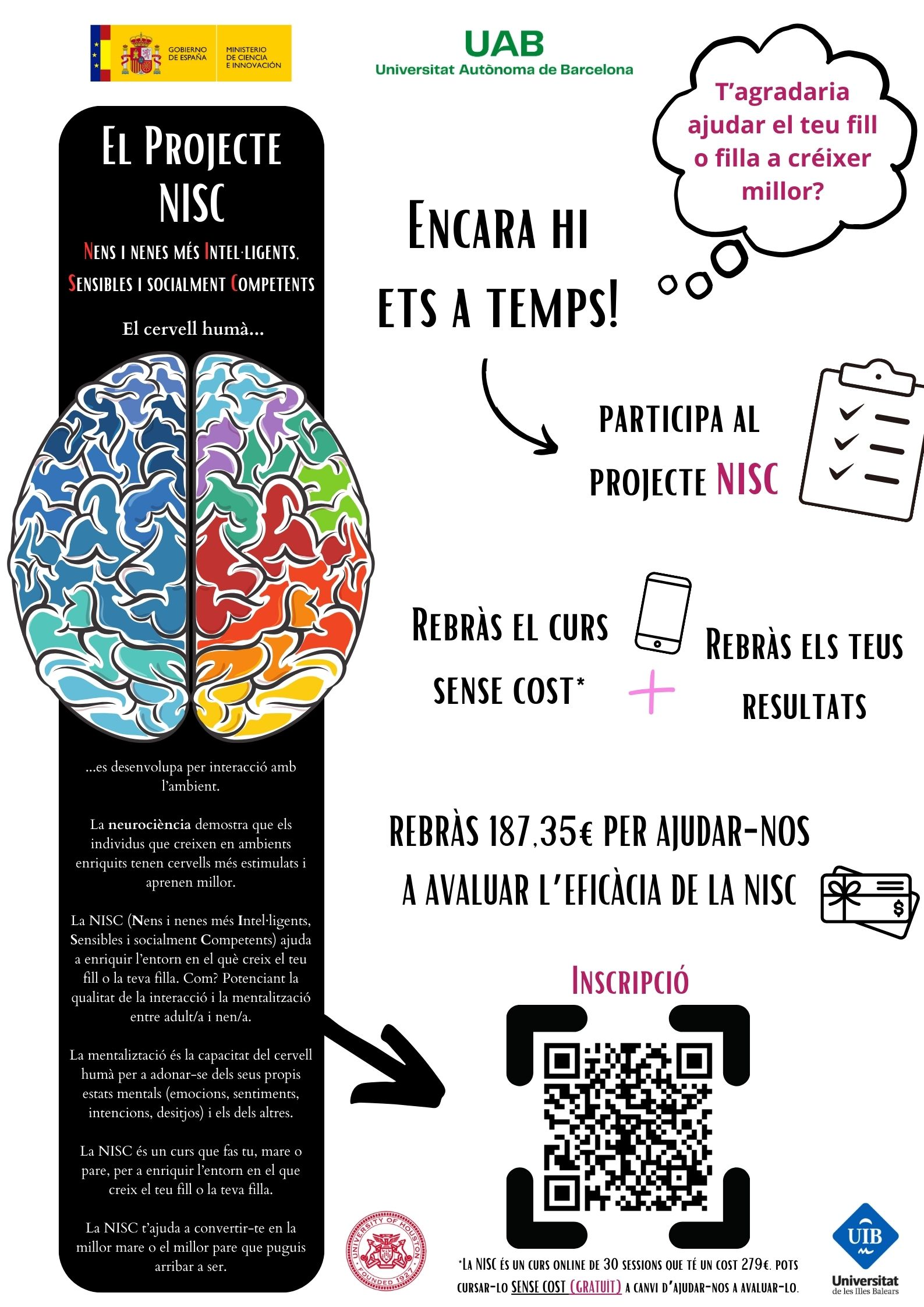 A canvi d’ajudar-nos a avaluar l’eficàcia de la NISC, el cost de la formació (279€) va a càrrec del Pla estatal d’I+D finançat pel Ministeri de Ciència i Innovació, que és qui finança l’estudi de la NISC. Són 300 places sense cost per al o la participant pel fet de participar a l’estudi.