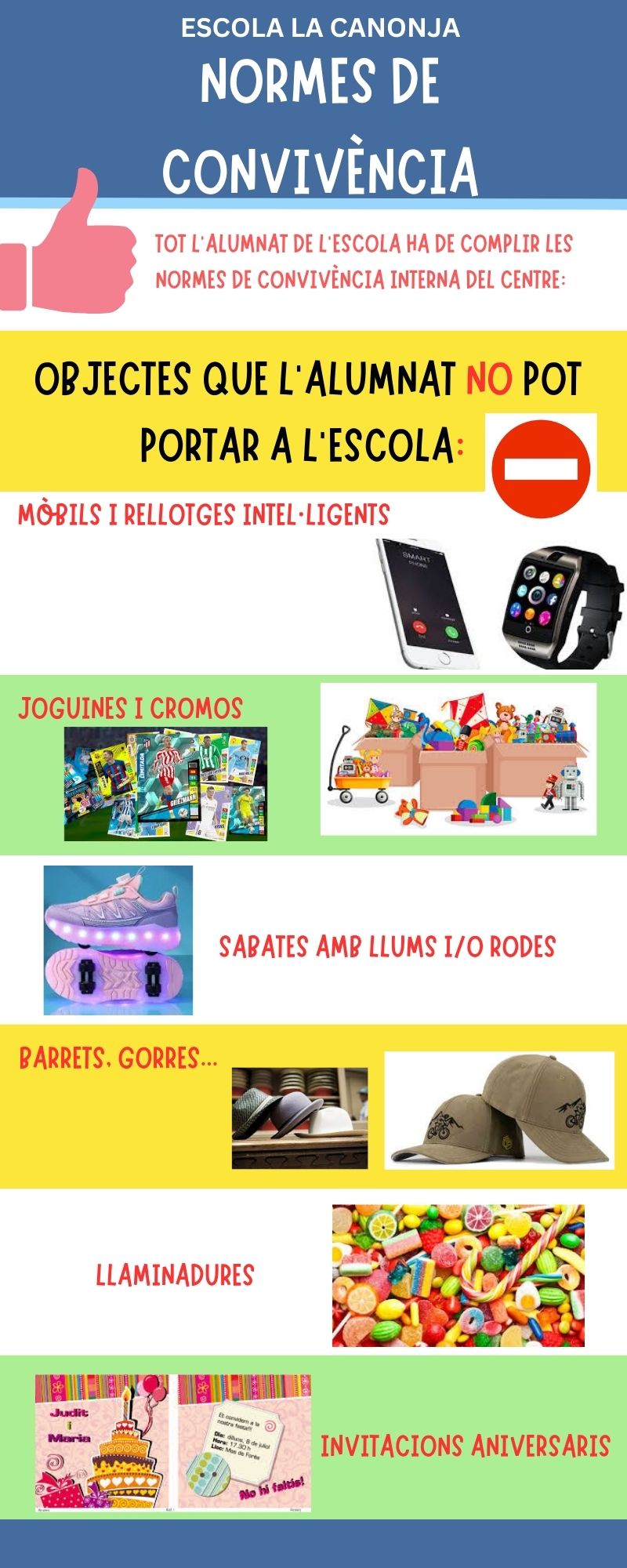 OBJECTES QUE L’ALUMNAT NO POT PORTAR A L’ESCOLA: mòbils, rellotges intel·ligents, joguines, cromos, sabates amb llums o rodes, barrets, gorres, llaminadures i invitacions festes aniversaris.