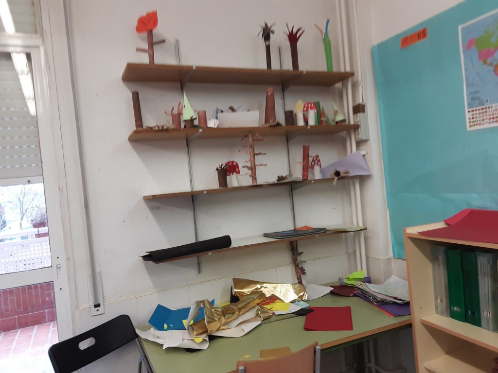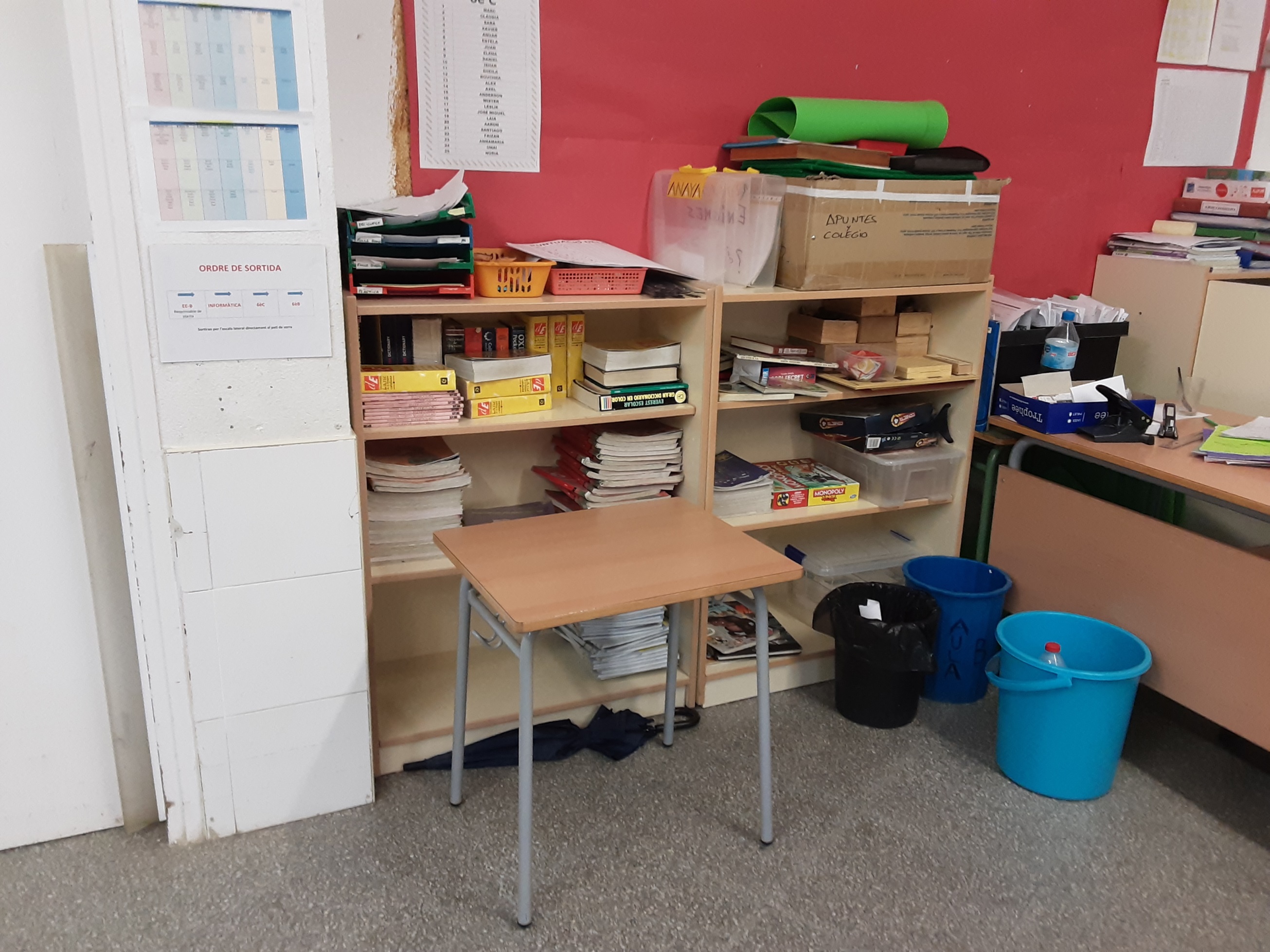 L’aula de 6è té 10 llums, un rellotge, un planisferi, dues pissarres, una prestatgeria d’atles, una altra de material de plàstica i una taula amb el mateix, un altre prestatge a l’altre punta amb guixos, material de decoració del cine, arxivadors, paper de cuina i una amb carpetes. A l’altra banda, també hi ha estanteries amb papers, geoplans, tisores, pega, regles i un maletí amb paperets de l’enigma, diccionaris i llibres d’assignatures, jocs i llibres de lectura.