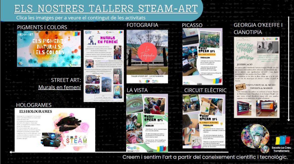 Aquest any ha estat el 3r d’una trajectòria STEAM que ens ha portat a reformular l’escola, adaptant-la a les noves demandes de la societat cada cop més tecnològica. Us exposem aquí els tallers d’art que hem elaborat, una (però no la única) de les actuacions que hem dut a terme al nostre centre. Clicant a