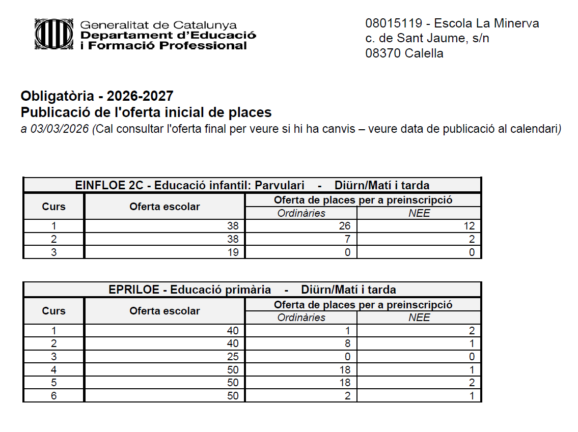 • 10 de juny de 2026: oferta final de places escolars