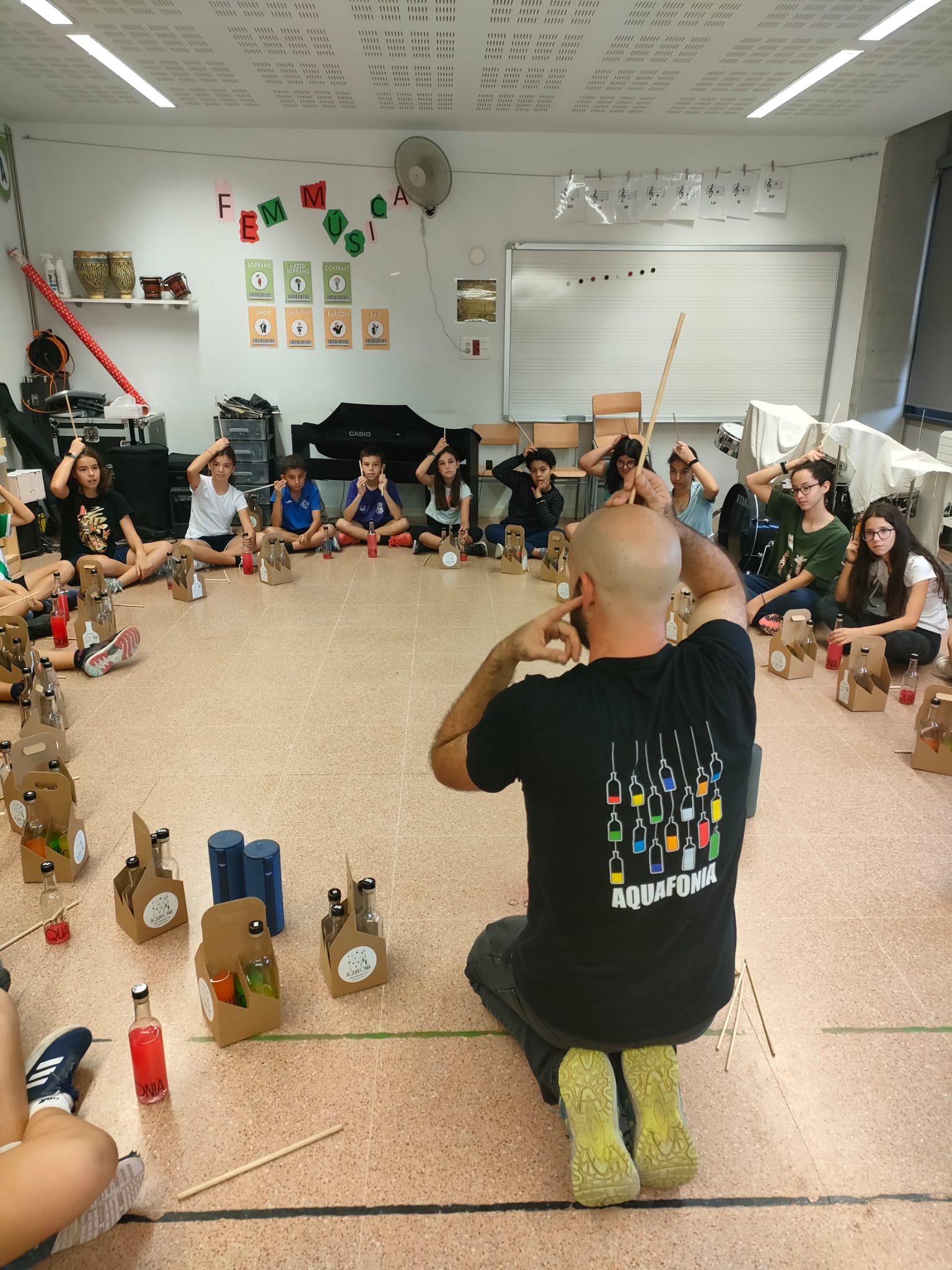 El passat dijous dia 19, el Pau Elias va venir a l’escola de la Mitjana a fer uns tallers de música amb aigua. Vam tocar ampolles de vidre i vam crear música.