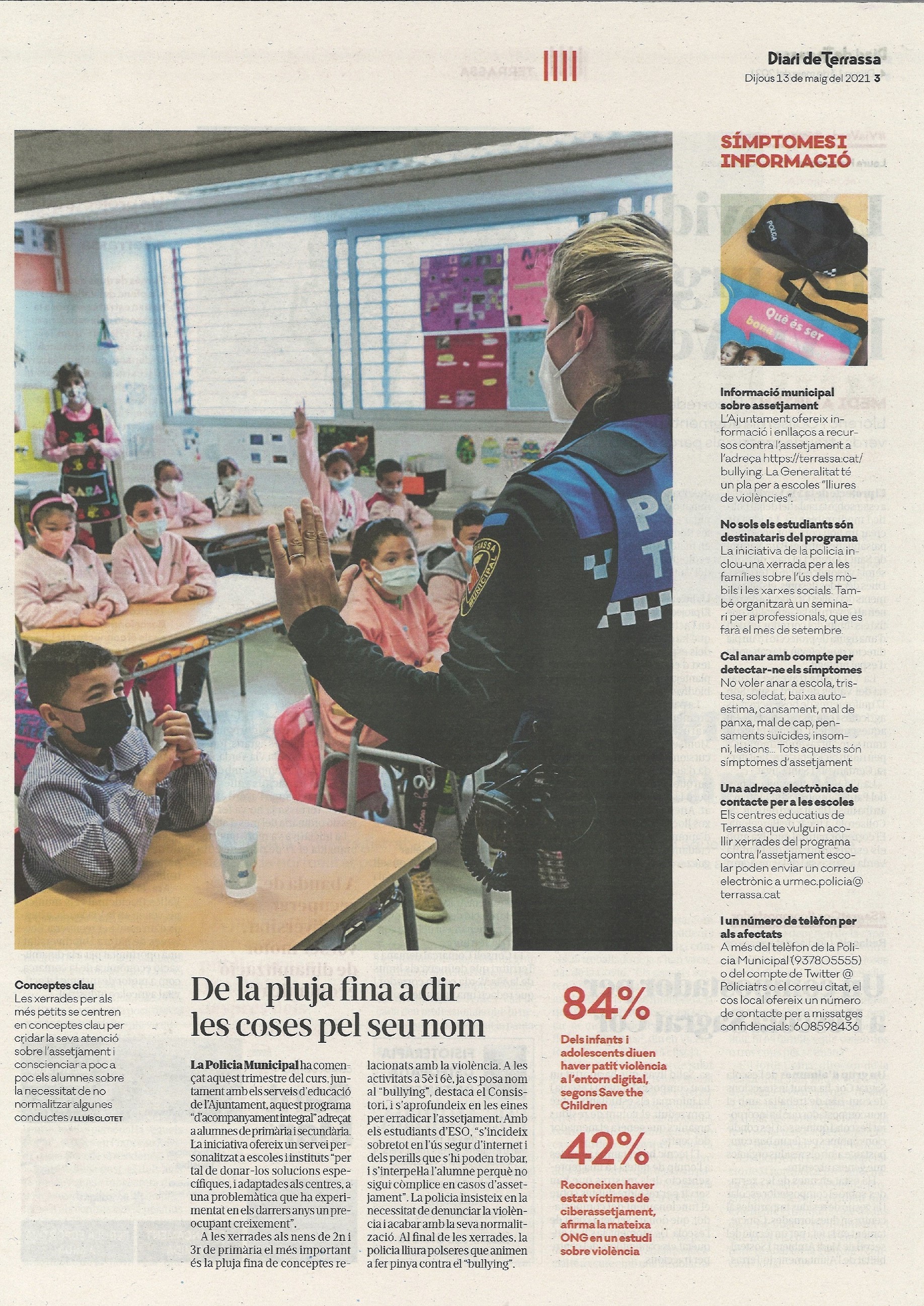 Els infants van gaudir d’una fantàstica xerrada pedagògica, promoguda per la Policia Municipal de Terrassa, que tenia per objectiu conscienciar sobre la necessitat de no normalitzar conductes que en un futur podrien desencadenar en assetjament escolar.