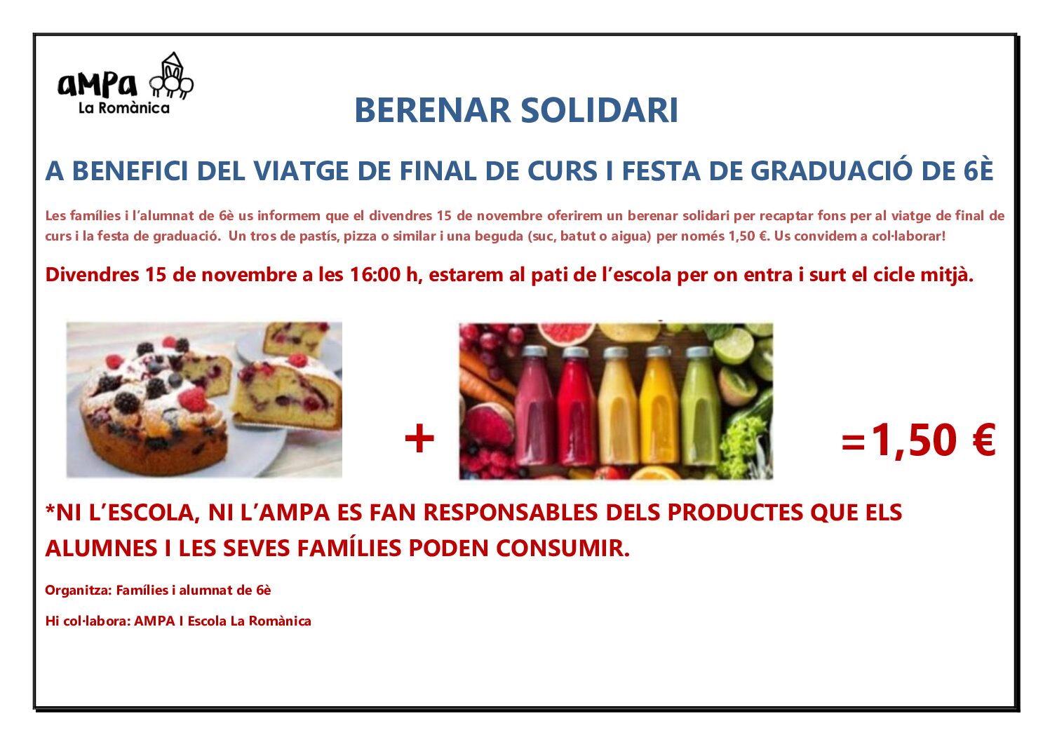 El proper divendres dia 15 de novembre a les 16.00 h i fins a les 16.45 h es farà un BERENAR SOLIDARI per recollir diners per la Festa de graduació de 6è i pel Viatge de final de curs al pati de sorra.