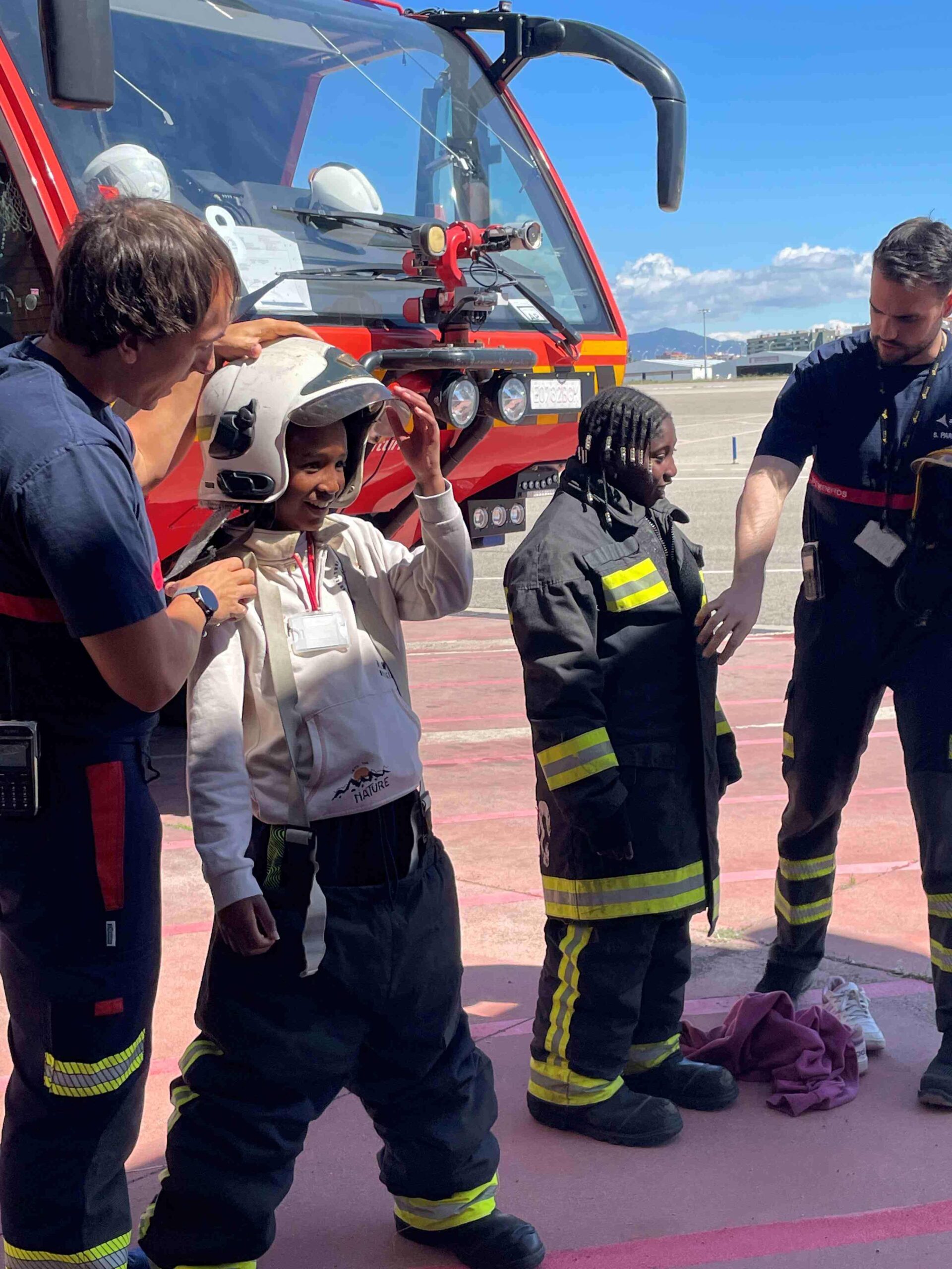 Els bombers ens van explicar el seu treball a l’aeroport i tots els infants es van provar el vestit i les botes de bomber.