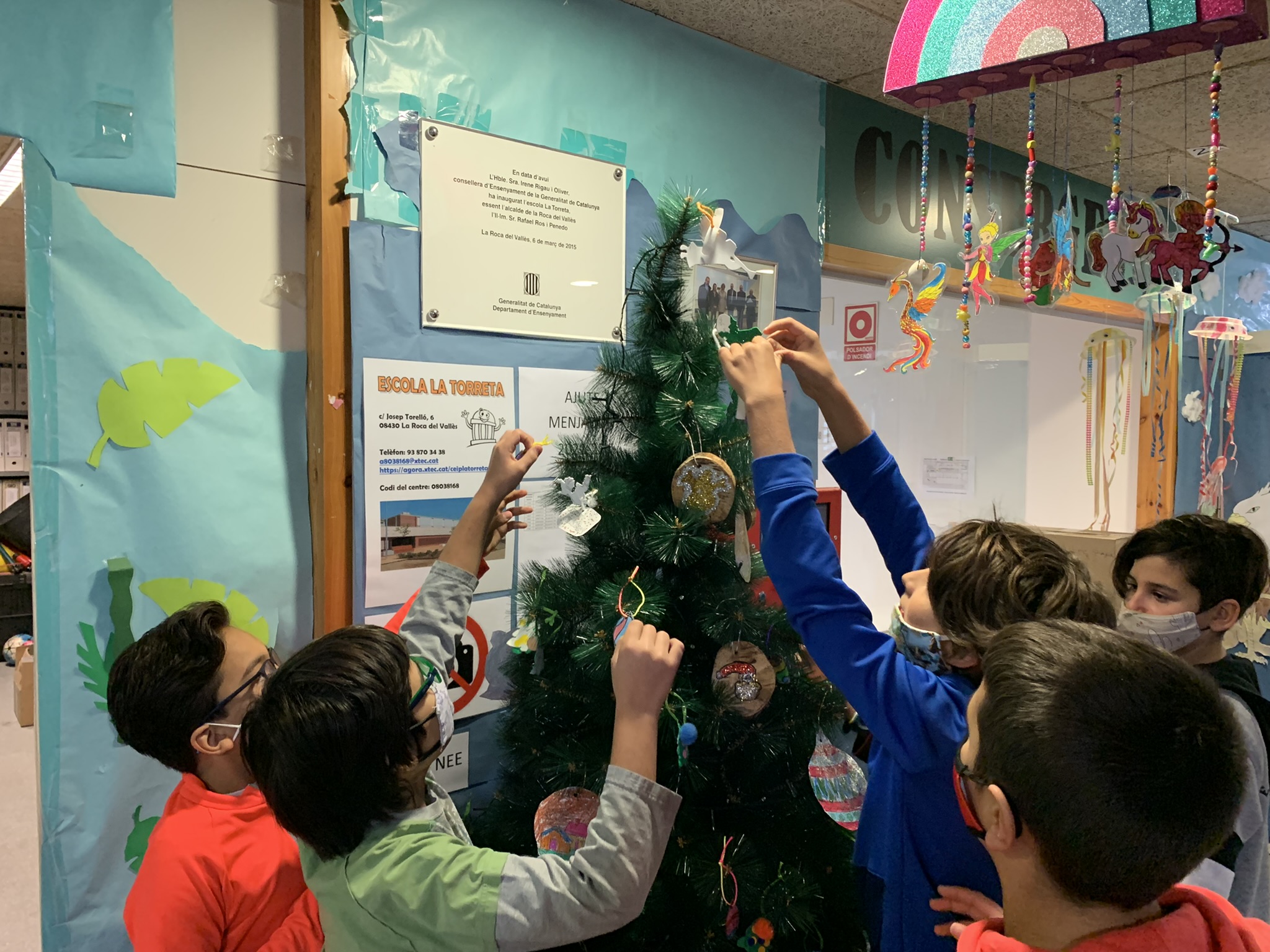 Aquest Nadal tornem a tenir una decoració ben especial al vestíbul de l’escola: dos arbres que entre tots i totes hem guarnit! Enguany els hem decorat amb elements creats per nosaltres mateixos i mateixes, com ara desitjos, dibuixos i treballs manuals. Tots ells amb materials ben diversos com cartolines, goma i fins i tot fusta!