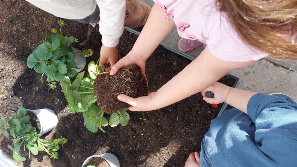 Hem anat a l’hortet de l’escola, on hem observat de prop les plantes i hem col·laborat en la seva cura, traient les males herbes i preparant la terra. Avui, a més, hem fet un pas més en aquest procés i hem plantat maduixeres, una activitat que ens ha fet molta il·lusió!