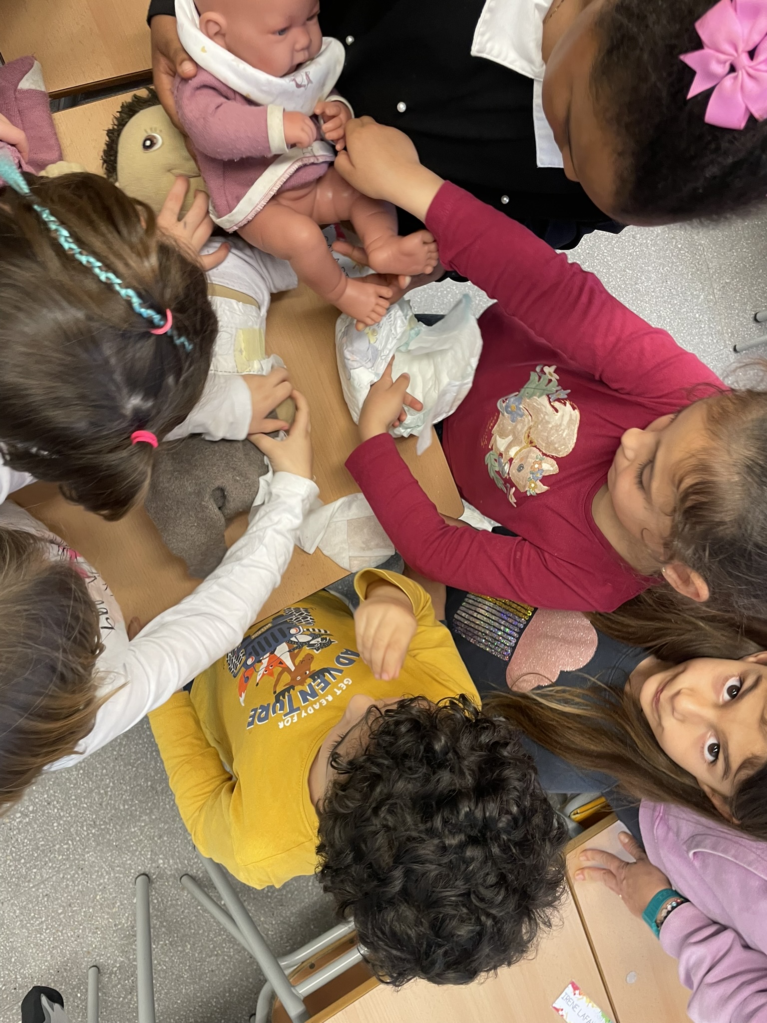 A continuació, els pares de la Carlota, que són mestres d’escola bressol, ens van ensenyar algunes imatges d’activitats que realitzen amb els seus petits alumnes. Ens van portar diversos jocs que utilitzen en les seves classes i ens van explicar com organitzen el temps i les activitats perquè els infants aprenguin i es diverteixin al mateix temps. Una de les activitats més interessants va ser aprendre a canviar bolquers, una tasca important per als mestres de l’escola bressol.