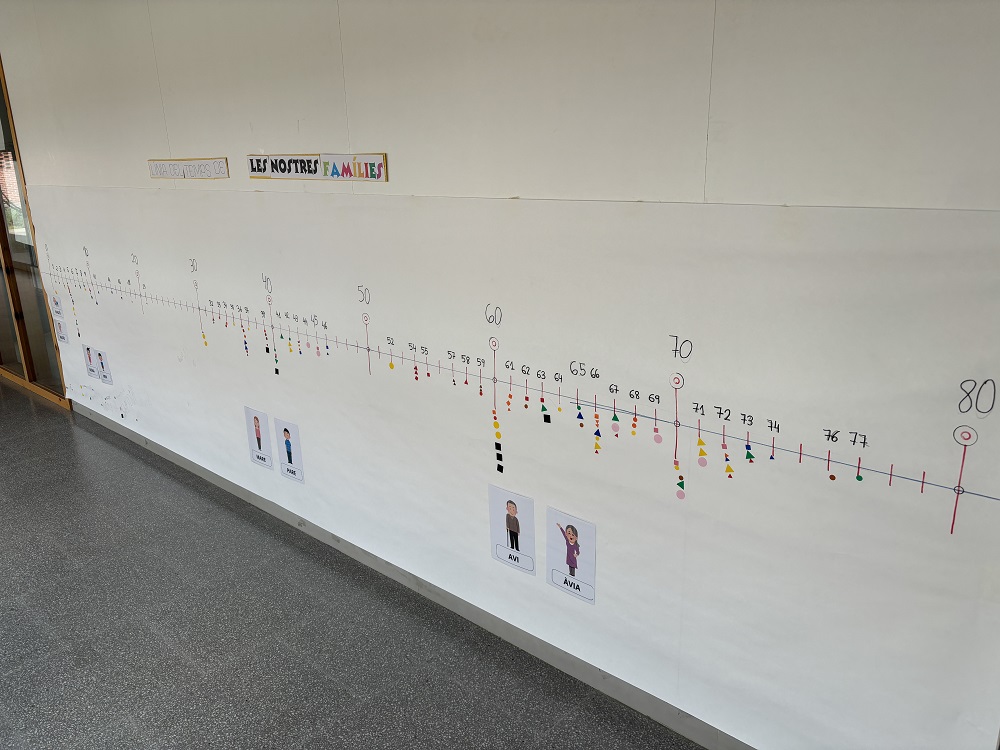 Una de les darreres activitats que hem fet és una línia del temps. Amb aquesta línia del temps hem pogut treballar la numeració fins el 80! També, hem fet una comparativa entre els números més baixos i els números més alts. A més a més, un cop col·locats tots els gomets hem observat que els membres de la família acostumen a situar-se tots en algunes franges d’edats semblants. Els primers números són pels fills i filles, els números del mig per les mares i els pares i els números més grans pels avis i àvies. Hem reflexionat sobre totes aquestes coincidències.
