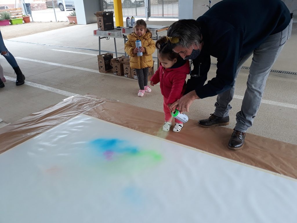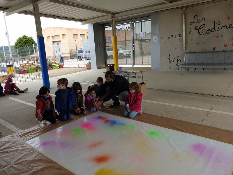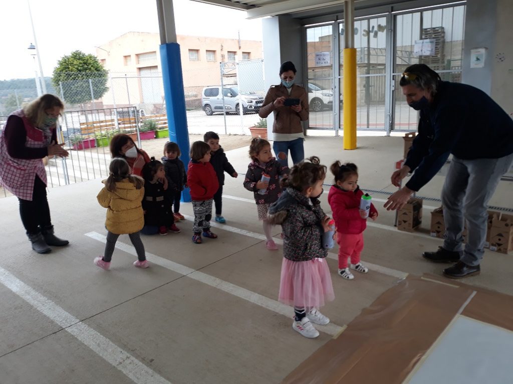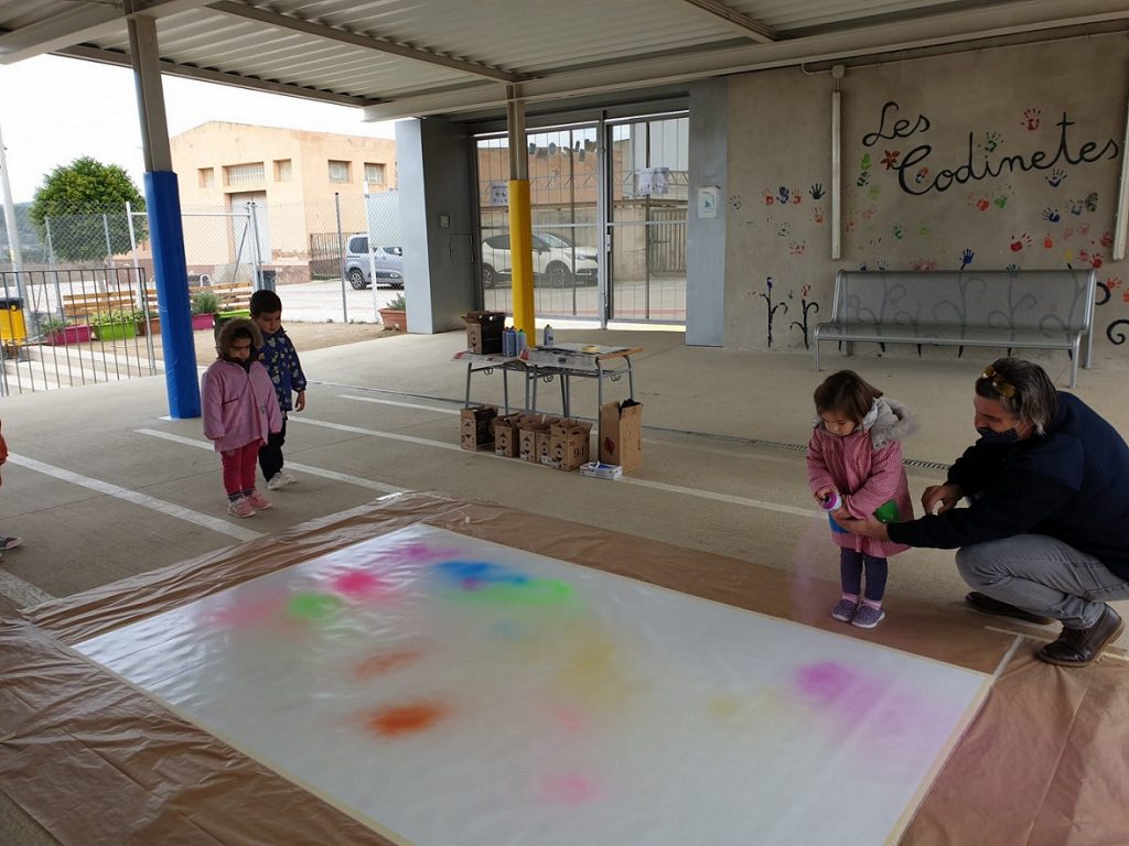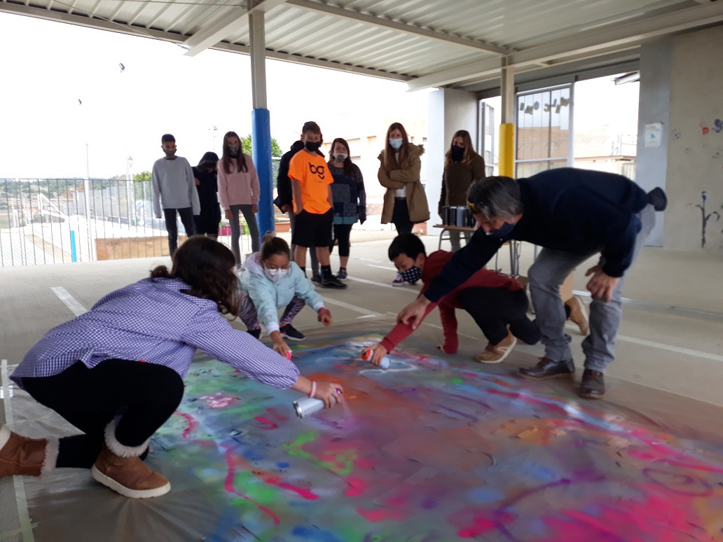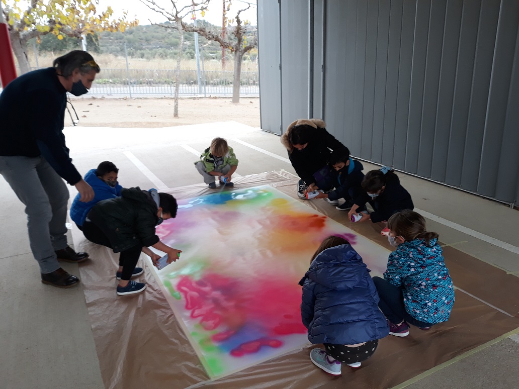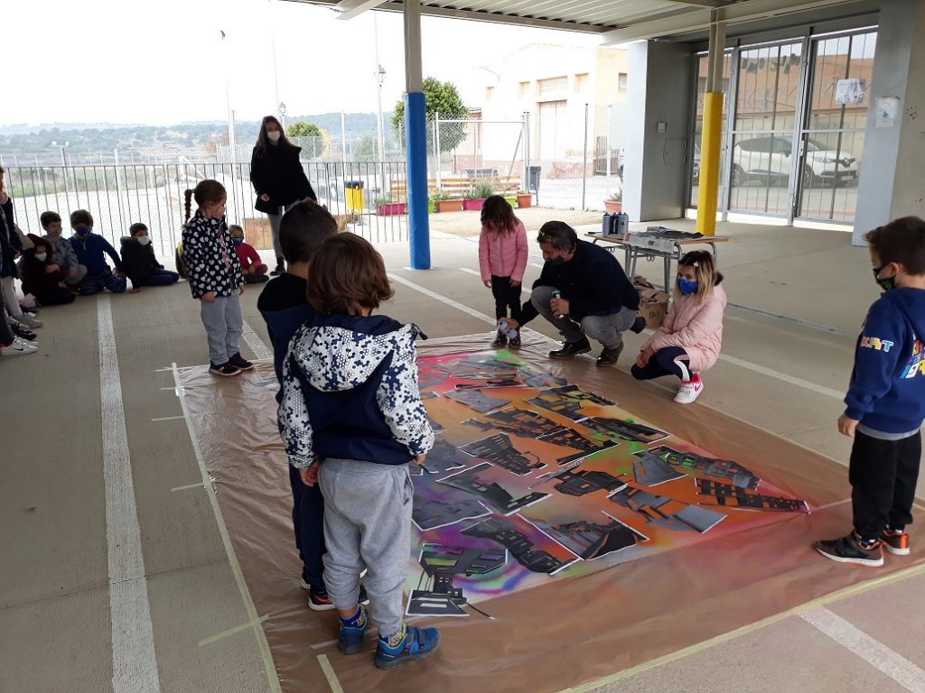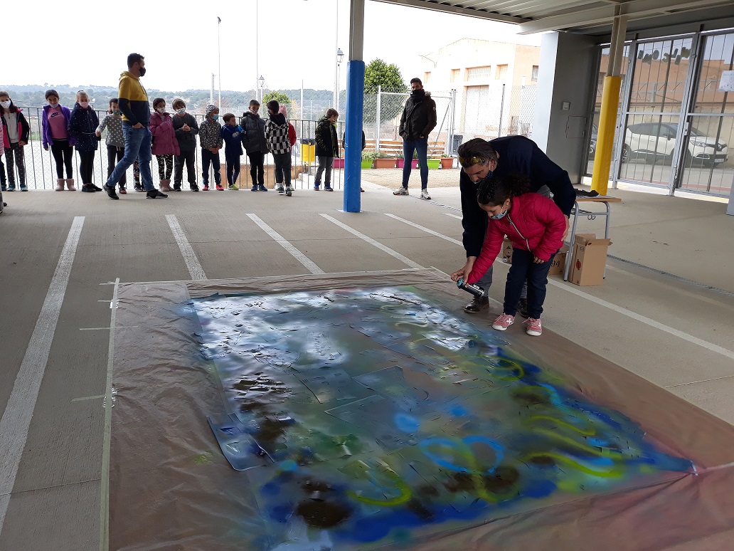 Seguim coneixent més sobre els nostres municipis. Avui ens ha visitat l’artista polifacètic i veí de Vespella de Gaià, l’Ismael Lozano, que ens ha fet descobrir la tècnica de l’aerògraf i l’esprai. Hem combinat i pintat el fons d’un mural gegant de molts colors, hem posat plantilles de les siluetes d’edificis i hem tornat a pintar a sobre. Hem participat tota l’escola.