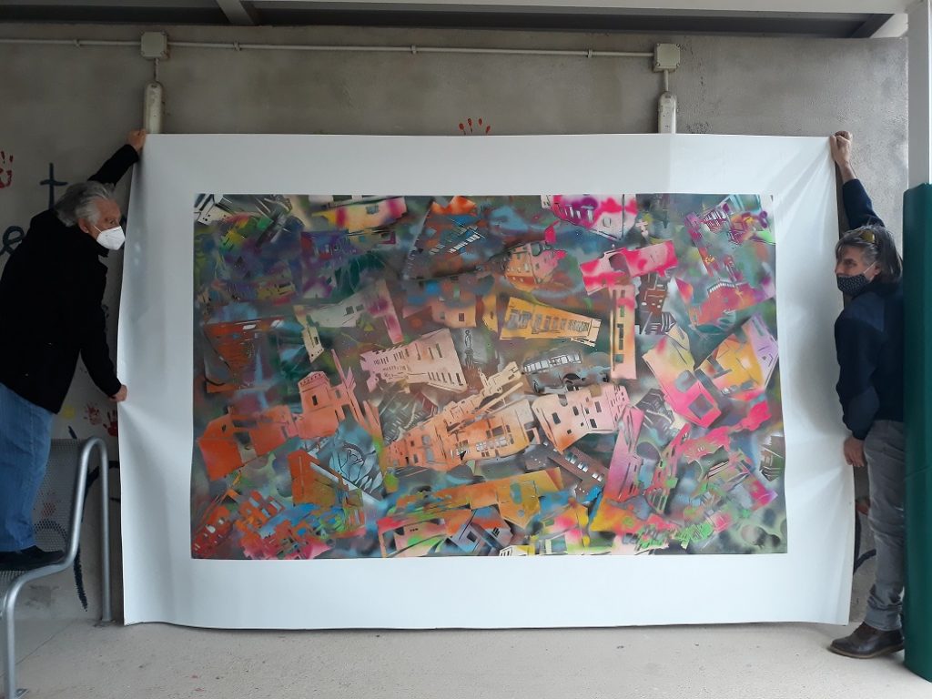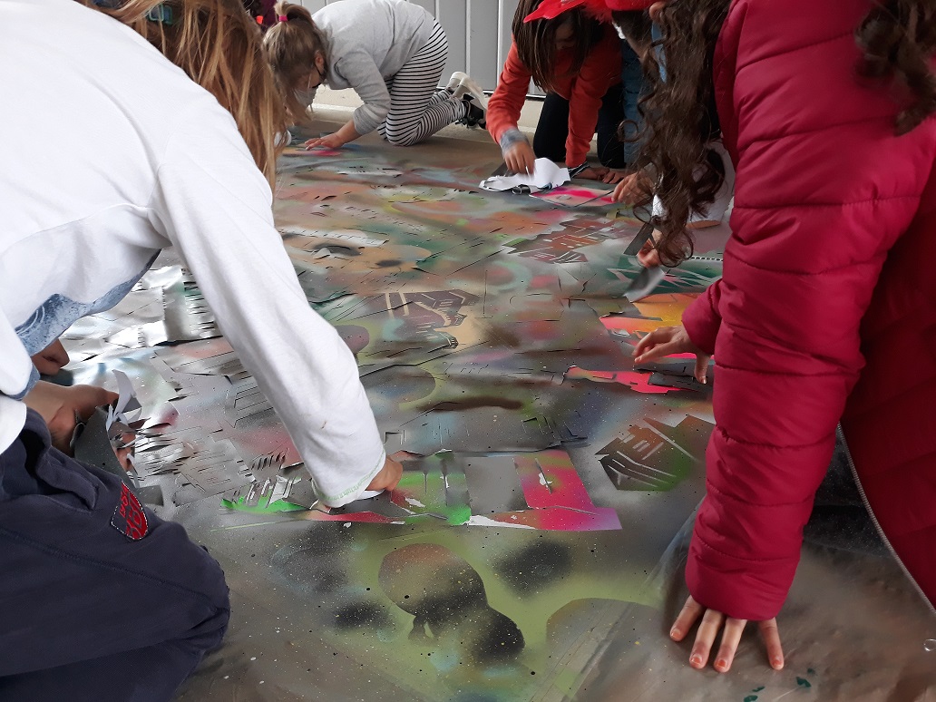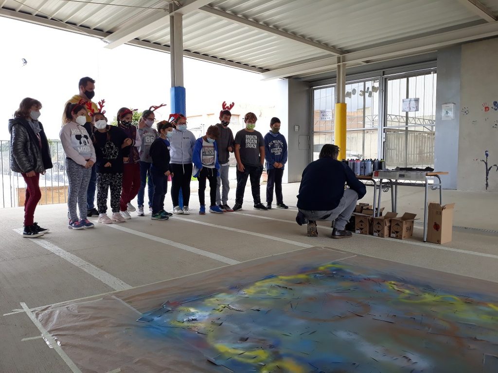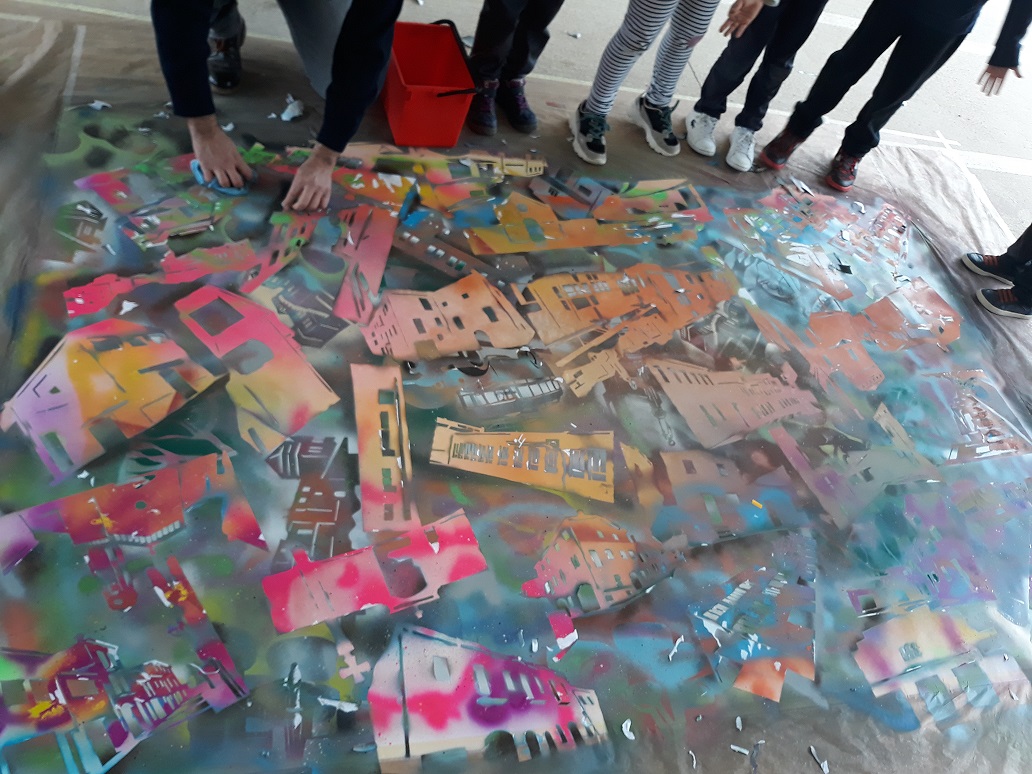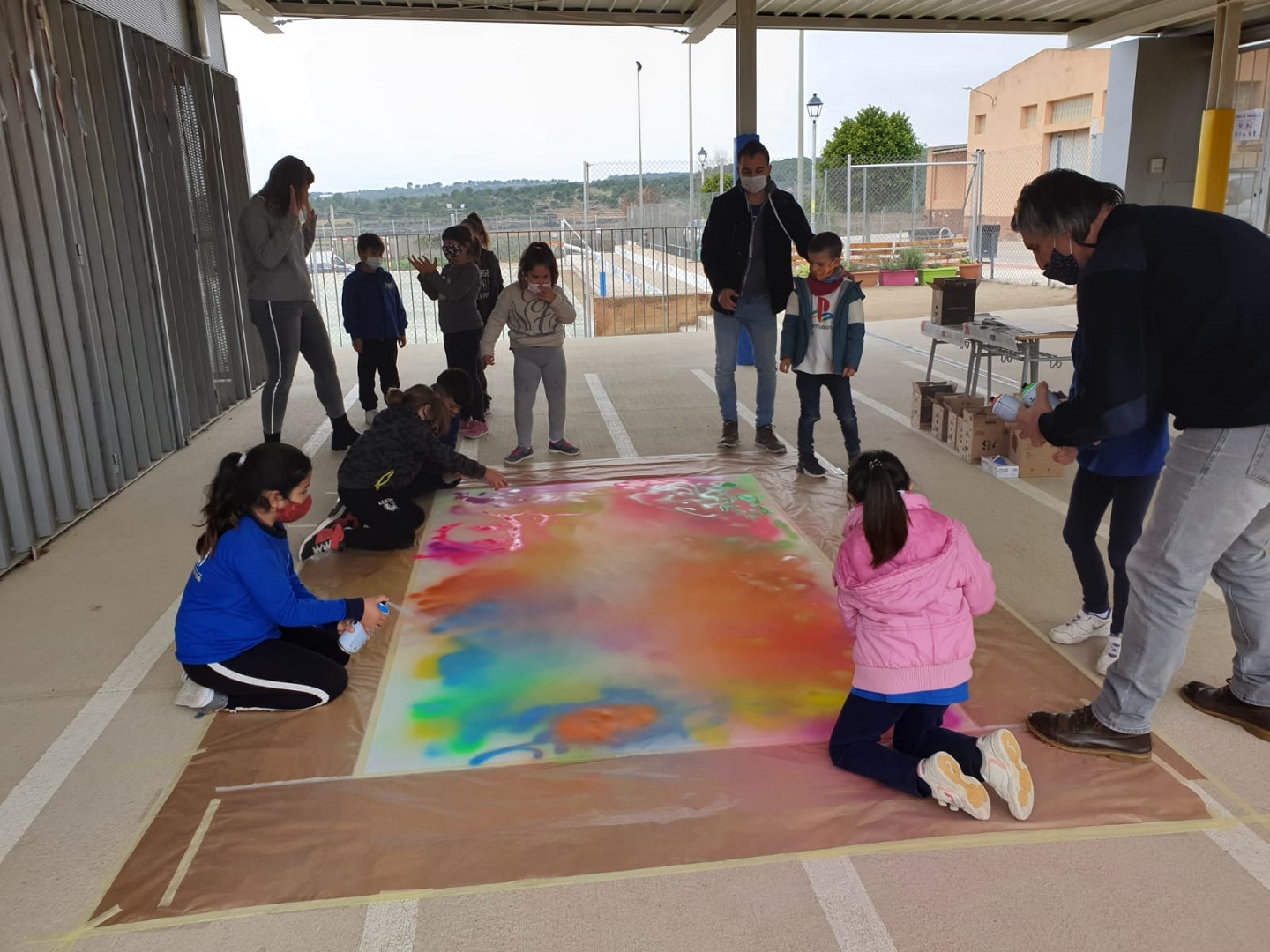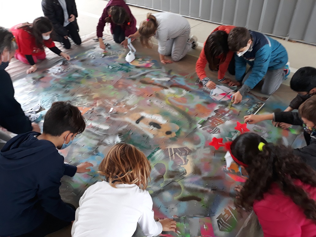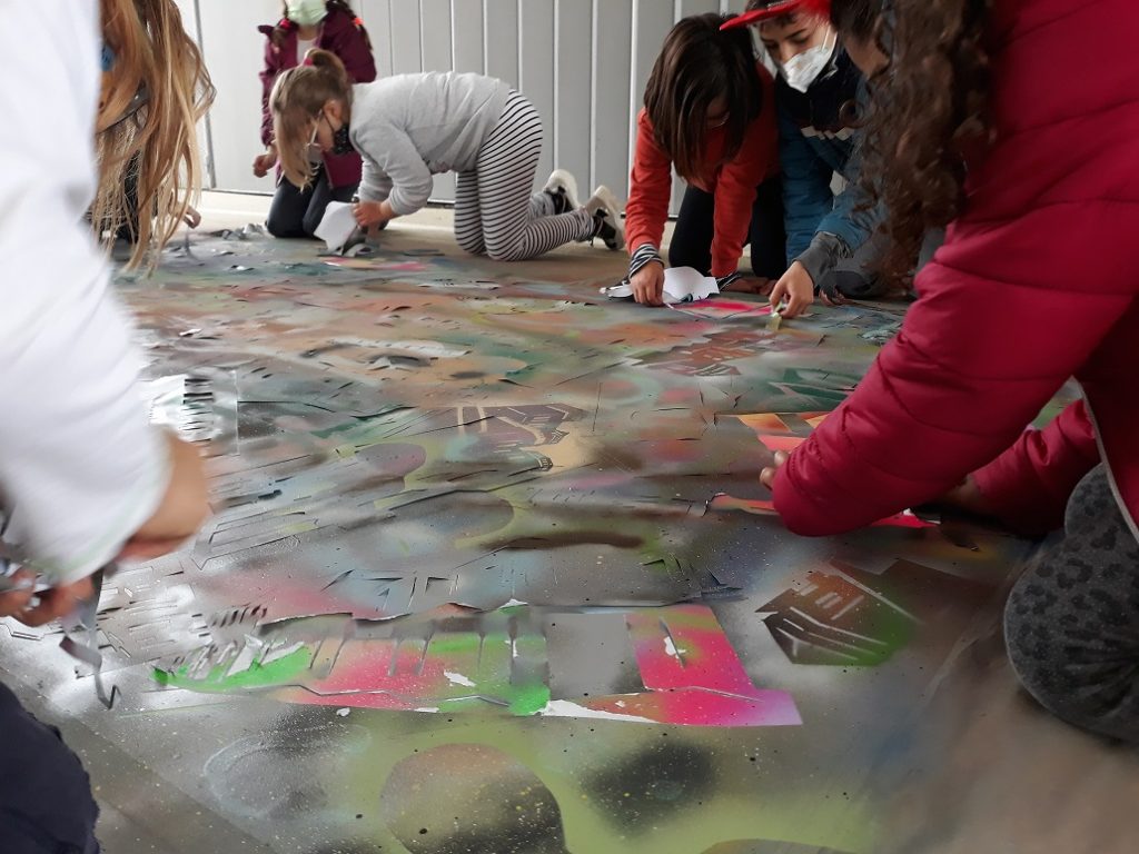 Seguim coneixent més sobre els nostres municipis. Avui ens ha visitat l’artista polifacètic i veí de Vespella de Gaià, l’Ismael Lozano, que ens ha fet descobrir la tècnica de l’aerògraf i l’esprai. Hem combinat i pintat el fons d’un mural gegant de molts colors, hem posat plantilles de les siluetes d’edificis i hem tornat a pintar a sobre. Hem participat tota l’escola.
