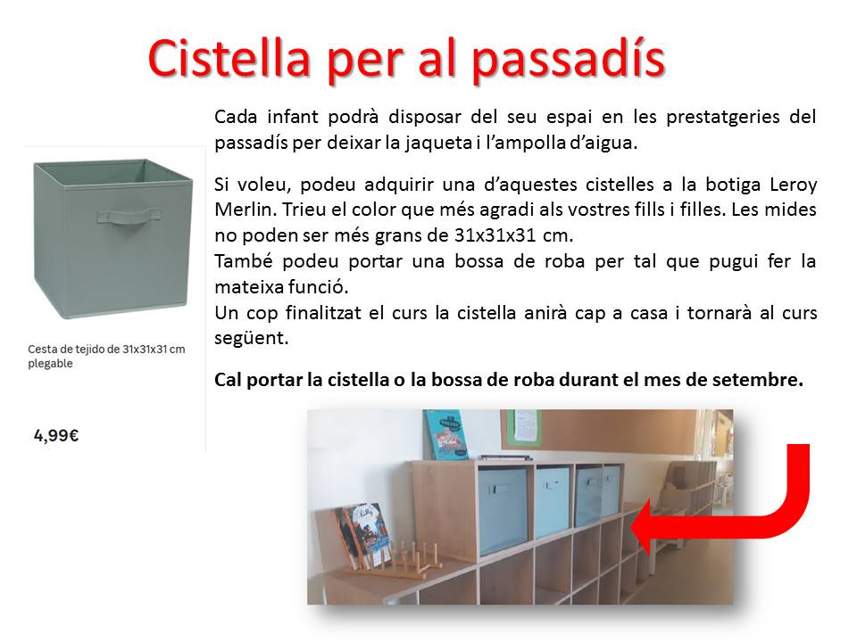 CISTELLA PER AL PASSADÍS ( escola bressol, infantil i primària)