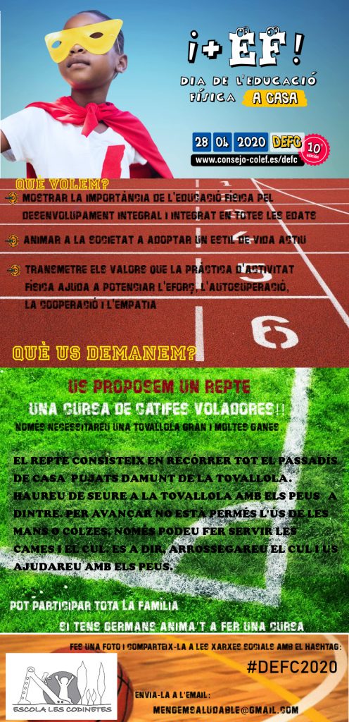 Aquí teniu les instruccions del repte. Recorda fer una foto i compartir-la a les xarxes socials amb el hashtag #DEFC2020. No t’oblidis d’enviar-la avui al mail de l’escola mengemsaludable@gmail.com. Amb totes les fotos rebudes es farà un vídeo i es compartirà a la web.