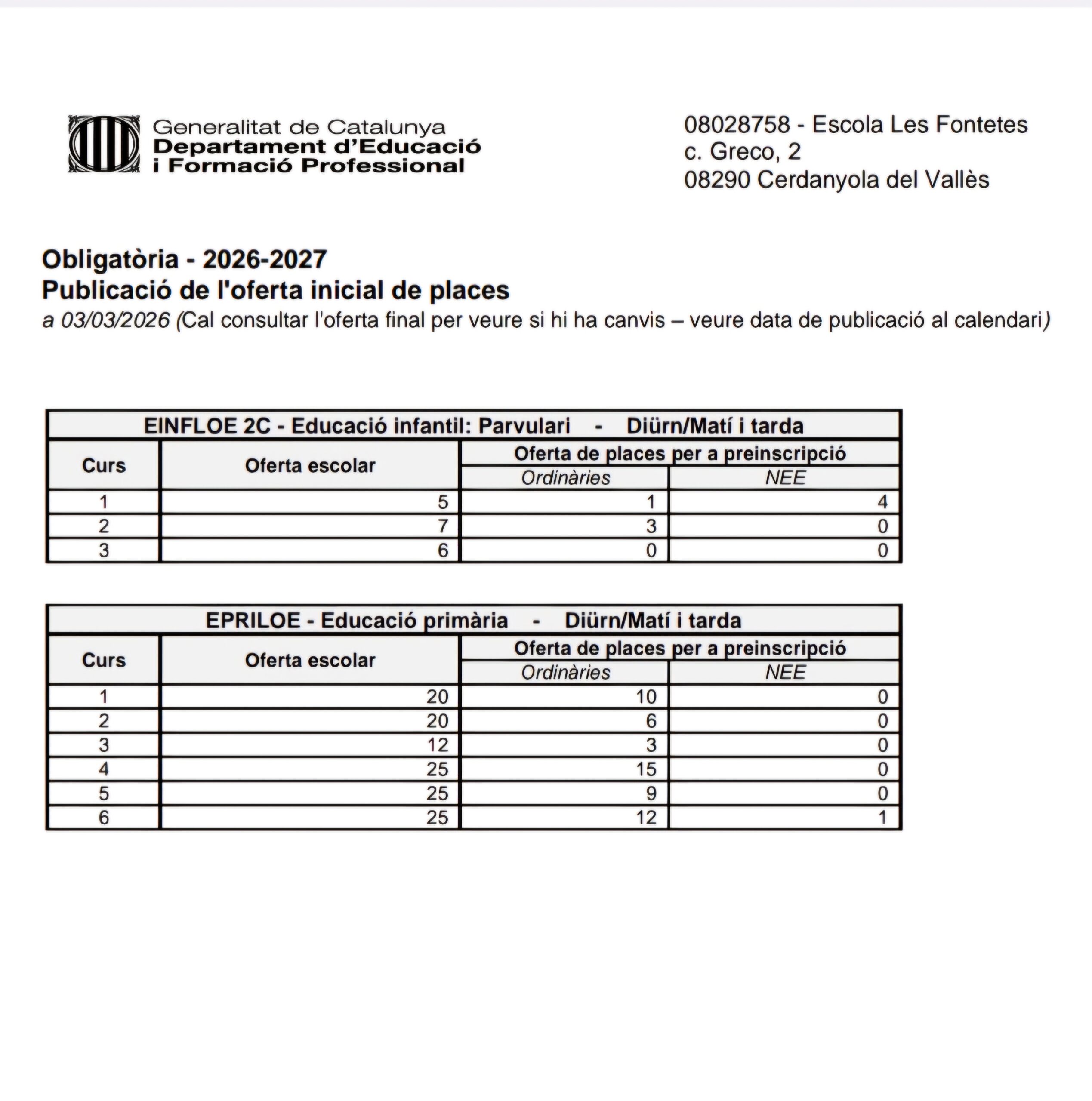 Ja es pot consultar l’oferta educativa inicial per al curs 2026-2027 de l’Escola Les Fontetes. En el document adjunt trobareu la informació oficial amb el nombre de places ofertades al centre.