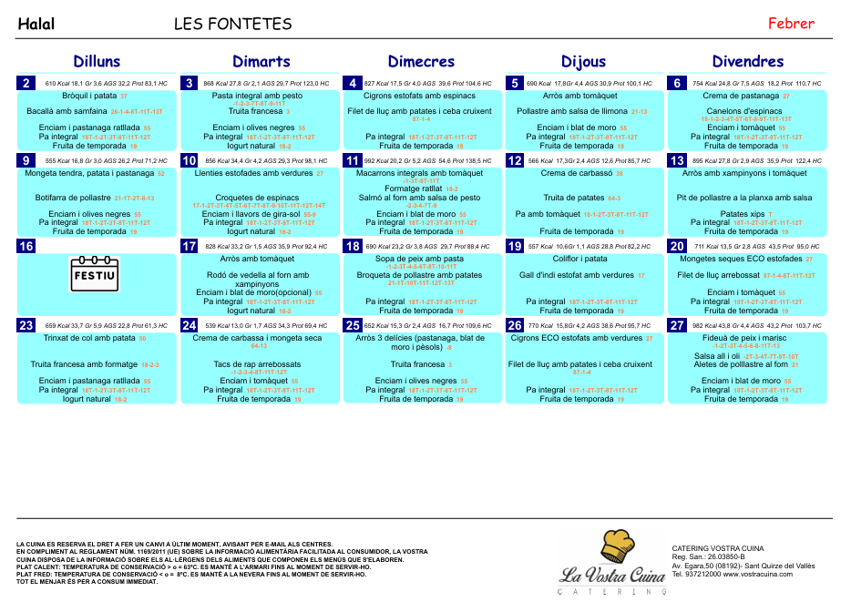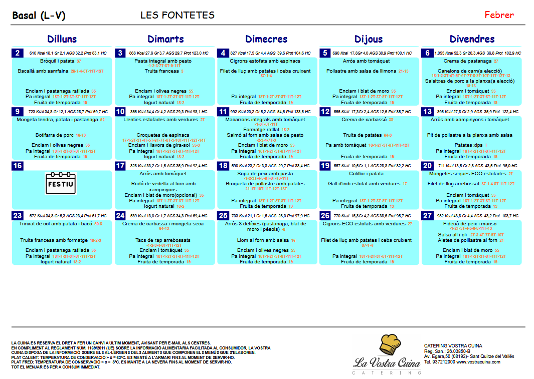 MENÚS FEBRER 2026 Feu un comentari / Per Kiara Plans / 24 de febrer de 2026 / Menjador escolar Càtering La Vostra Cuina del mes de febrer