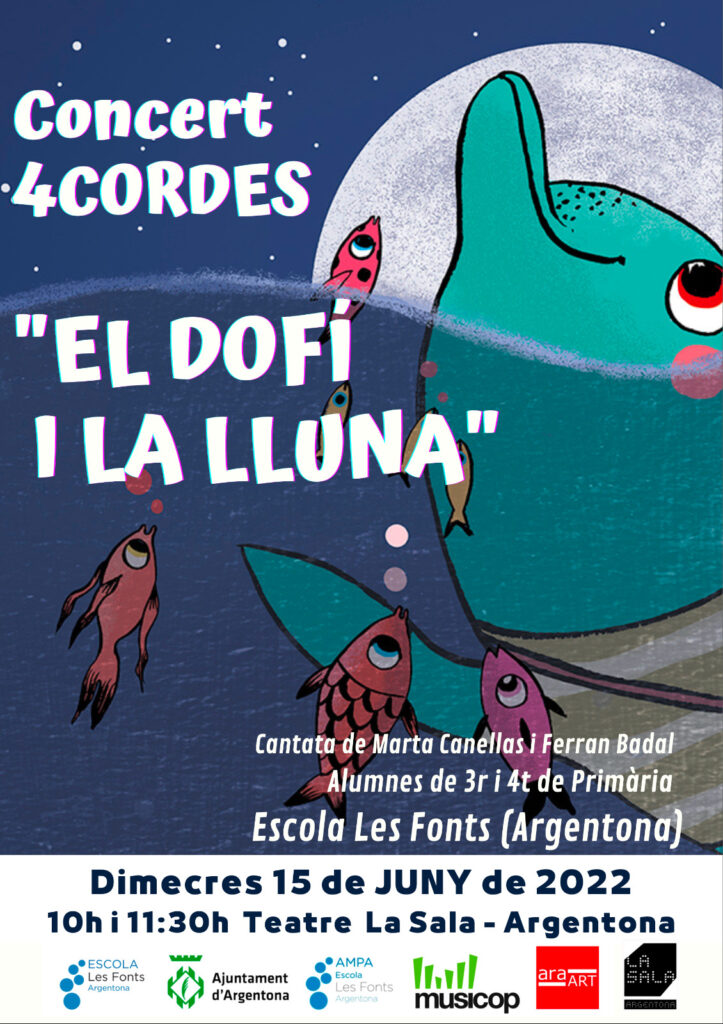 El passat 15 de juny de 2022 els grups de 3r i 4t de l’escola van realitzar el concert 4Cordes  “El Dofí i la Lluna” al Teatre La Sala d’Argentona. Es van dur a terme dues representacions, la primera adreçada a tots els nens i nenes de l’escola i la segona a les famílies. Vam comptar amb la col·laboració de dos narradors de 6è i ens van acompanyar músics professionals. El resultat va ser espectacular!!! Enhorabona artistes!