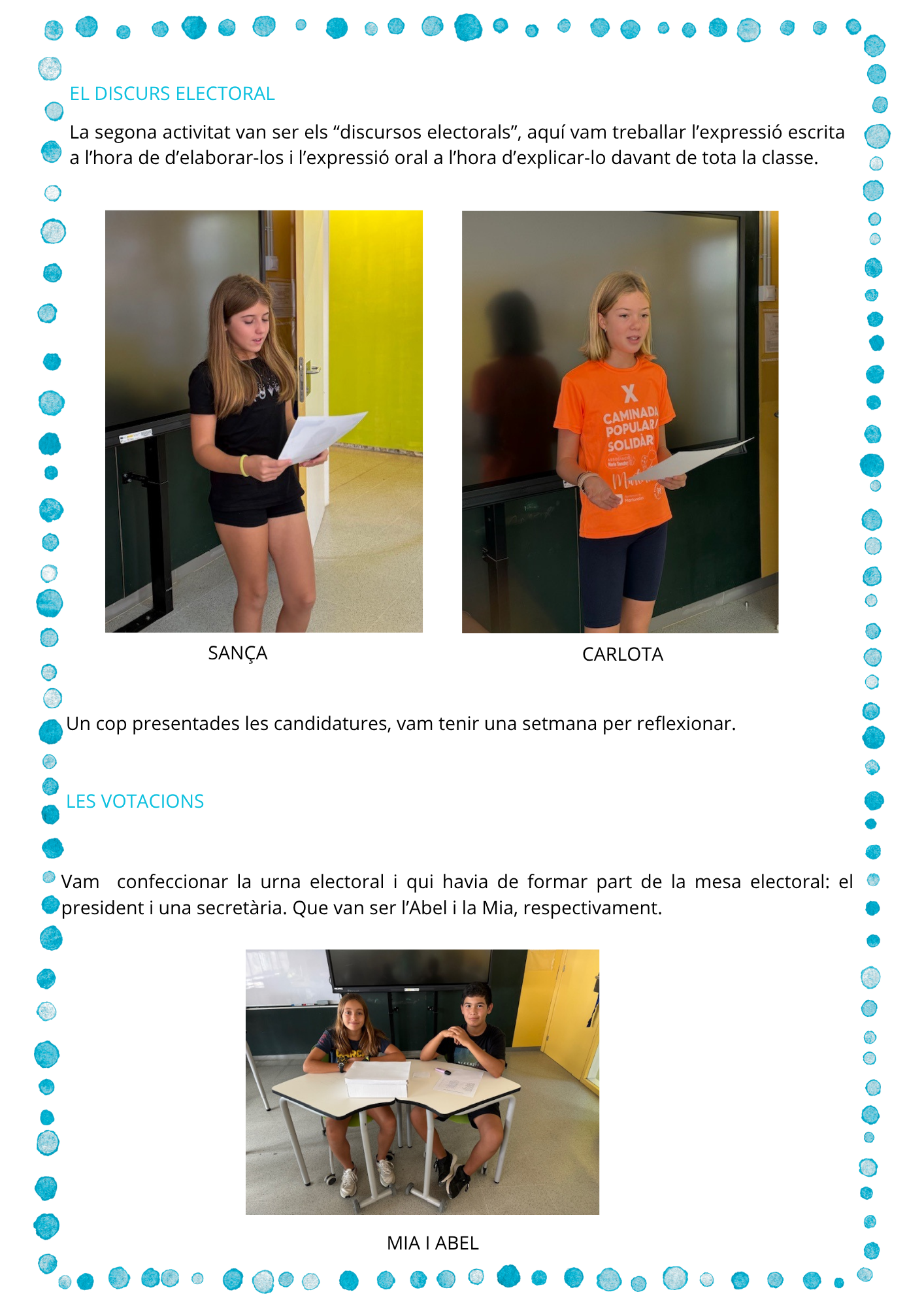 Aquest procés ens ajuda a treballar valors democràtics, participació, responsabilitat i compromís dins de la vida escolar, i és també una manera de donar veu a tot l’alumnat en l’organització de la classe i de l’escola.