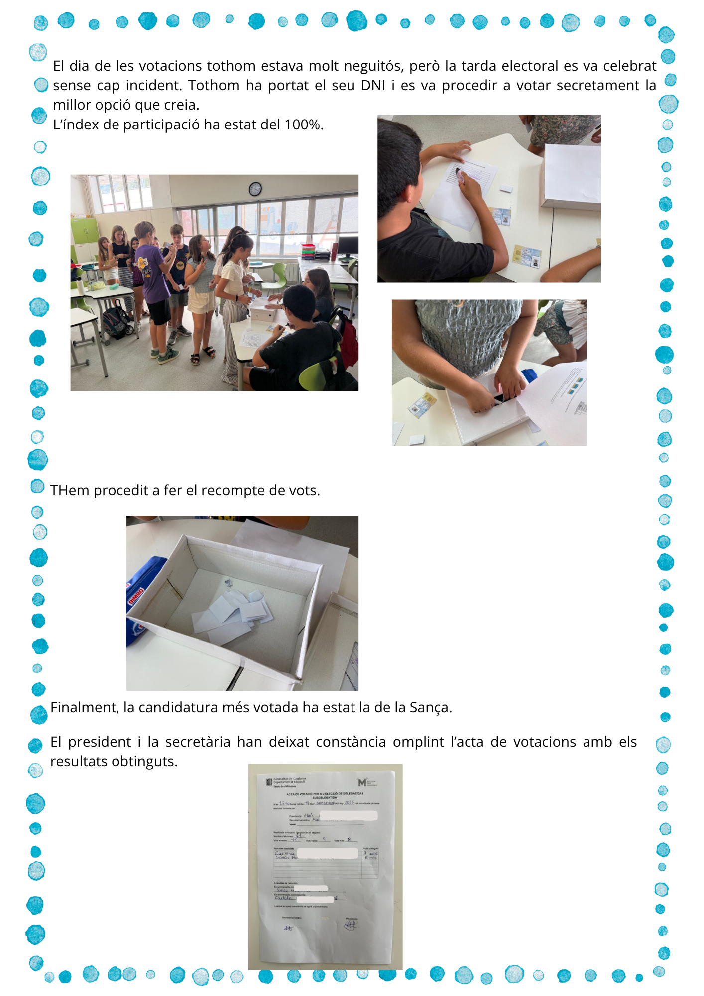 Es tracta d’un procés democràtic que fem cada inici de curs durant les sessions de tutoria. L’objectiu és que l’alumnat participi en la tria de les persones que els representaran al llarg del curs.